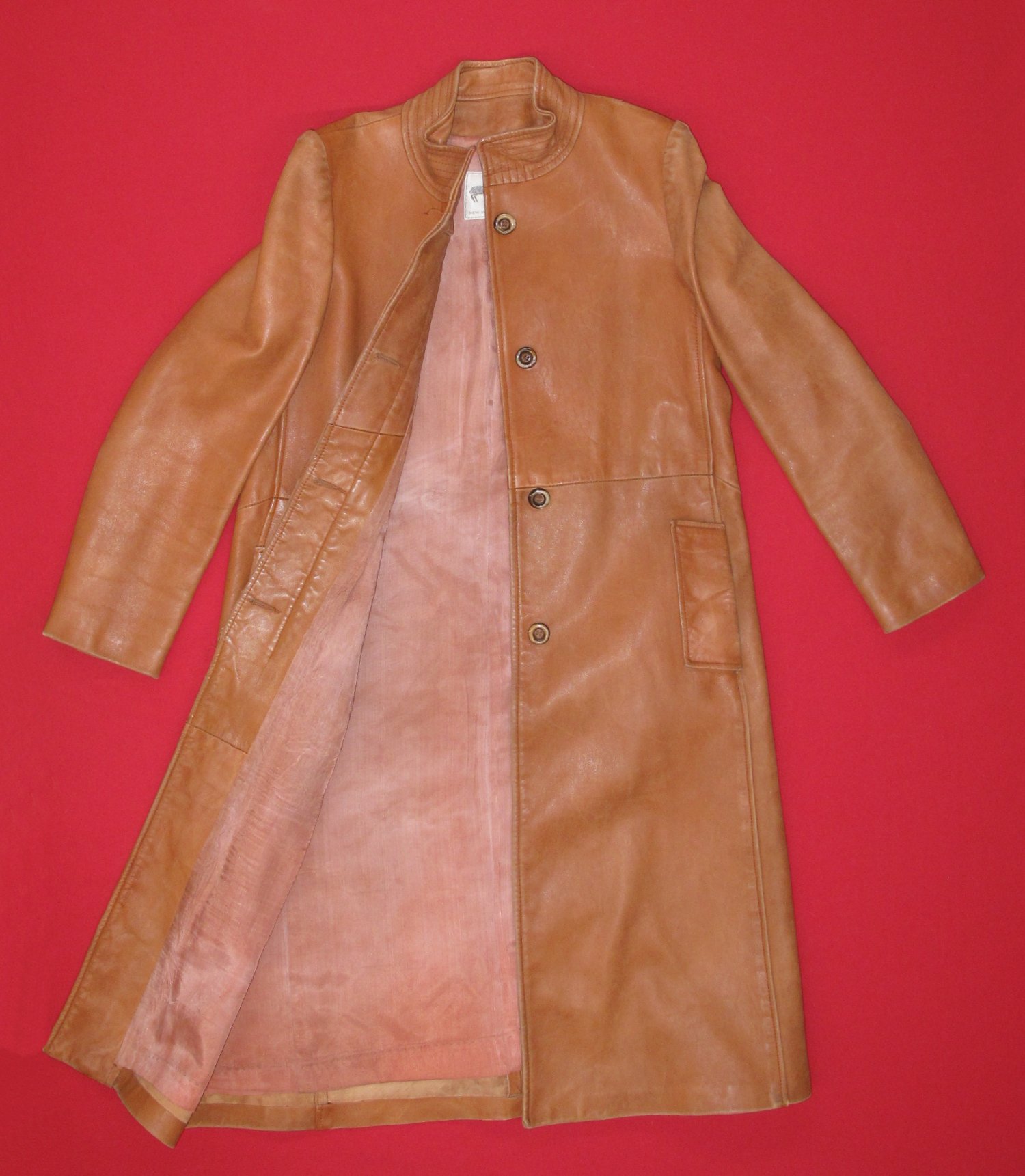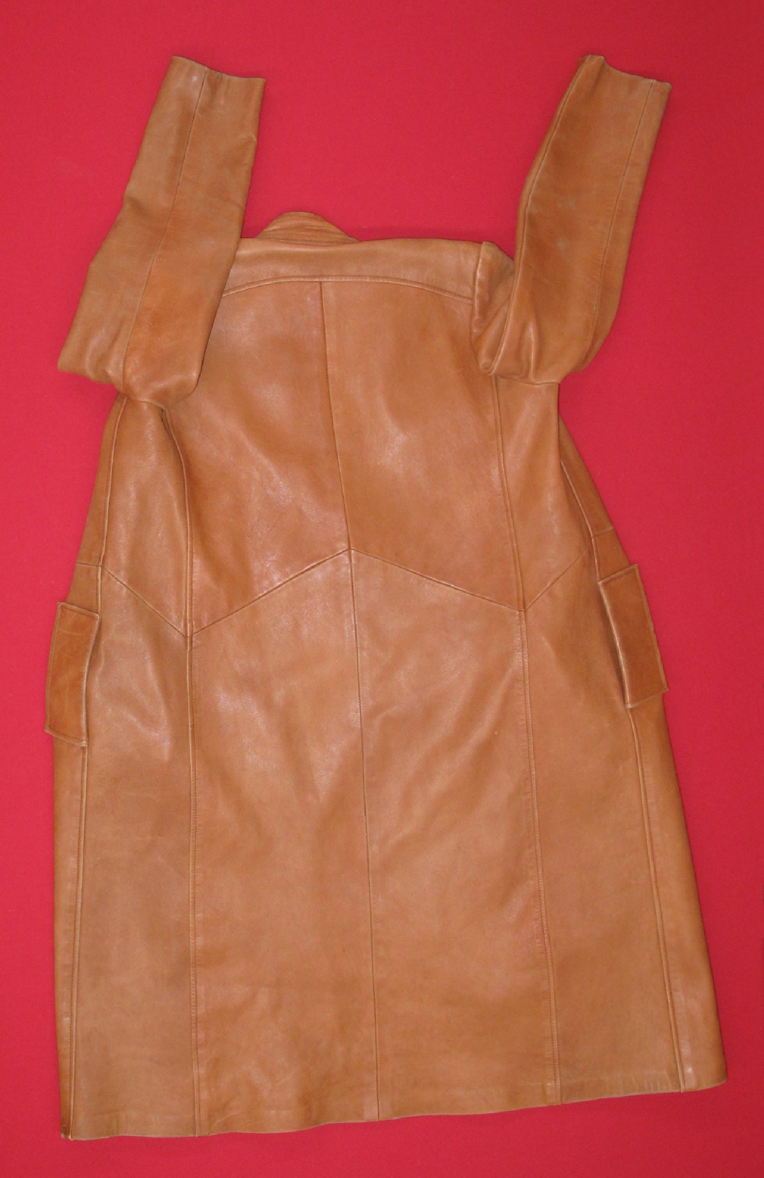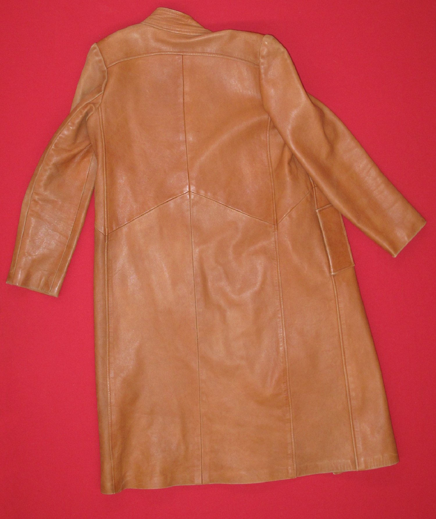 Lot # 1999-0036Full length leather coat-~44" longsaddletan color Pieces: medium size+ ea label says "SHEEP MATES, New York, Paris". Has light pink liner. Four buttons. Has pocket each side. Has slight amount of wear. Probably made from sheep leather.......... Excellent craftmanship $15.00 /eaBkskn Room |