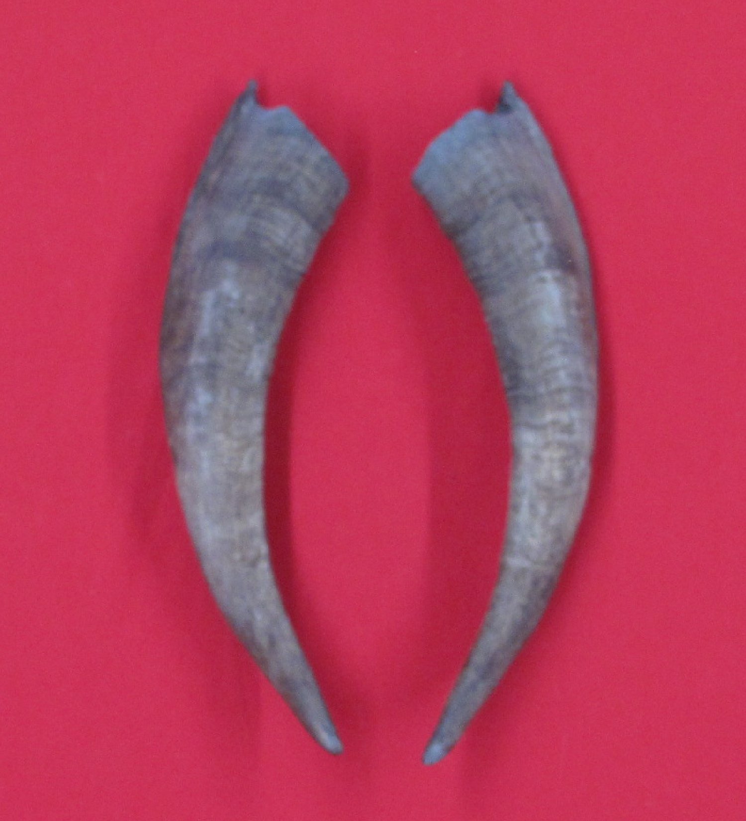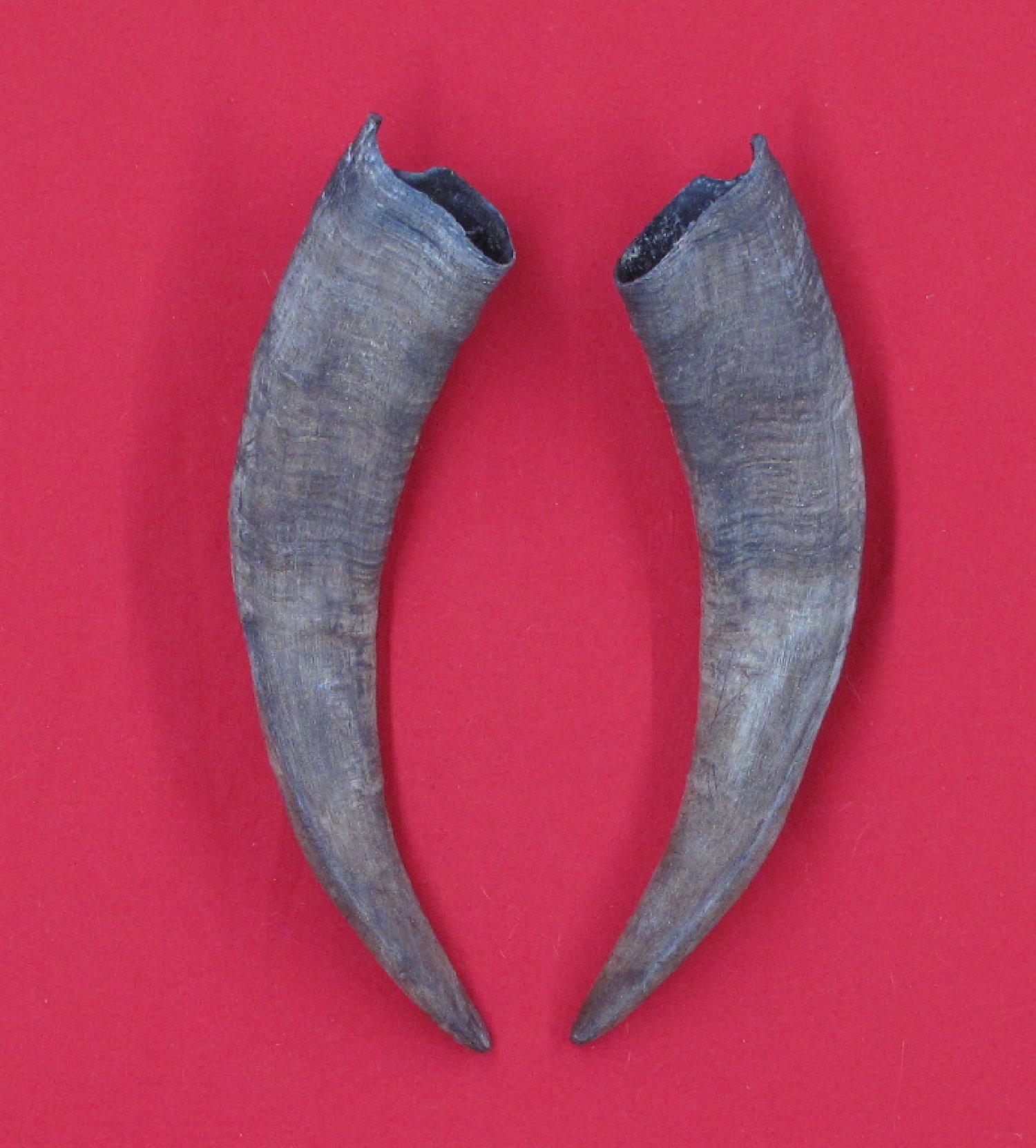 Lot # 2525-9988Pairs14-15" long no bony cores outside sheaths only dark brown color #1 except extra, extra small notch in outside edge of left horn $35.00 /eaS-535 |