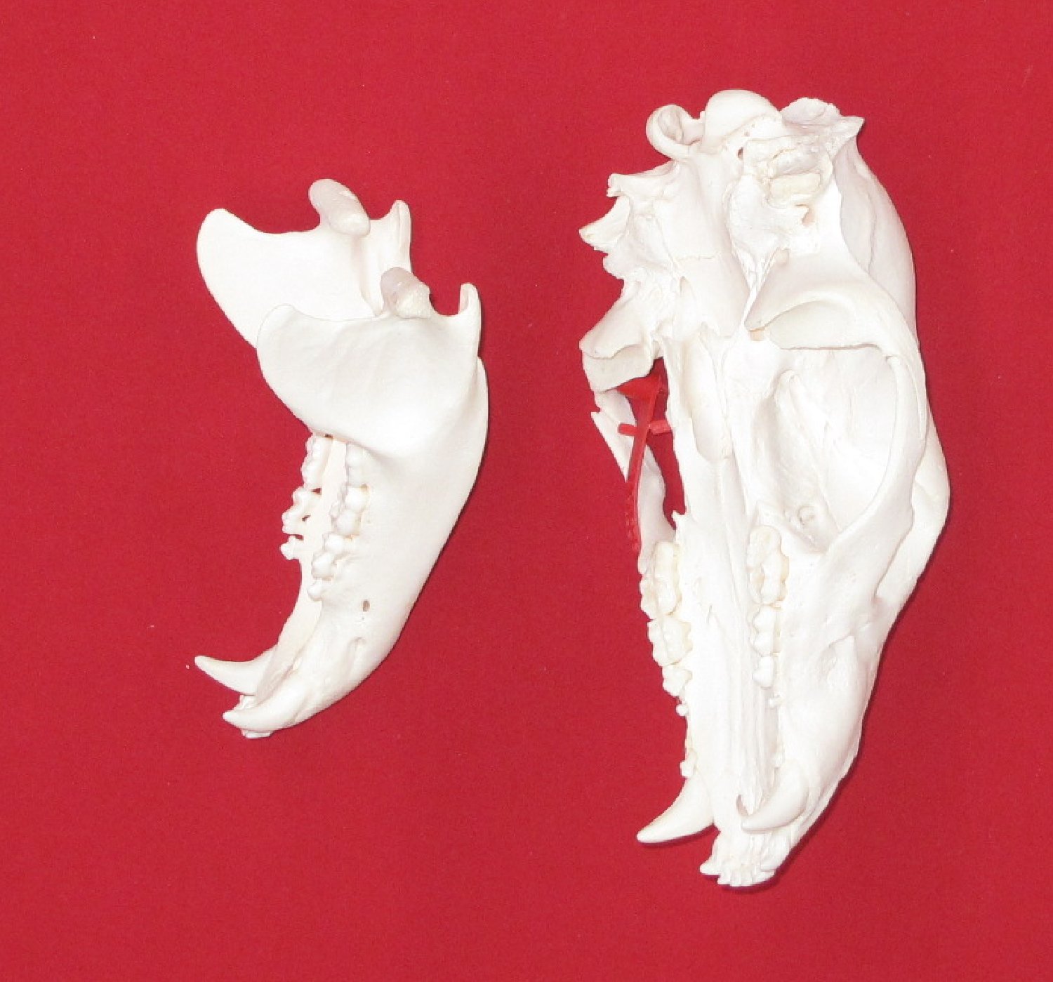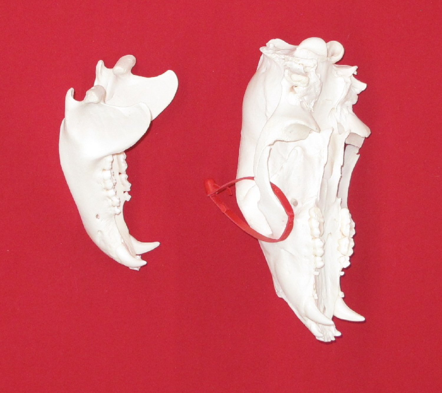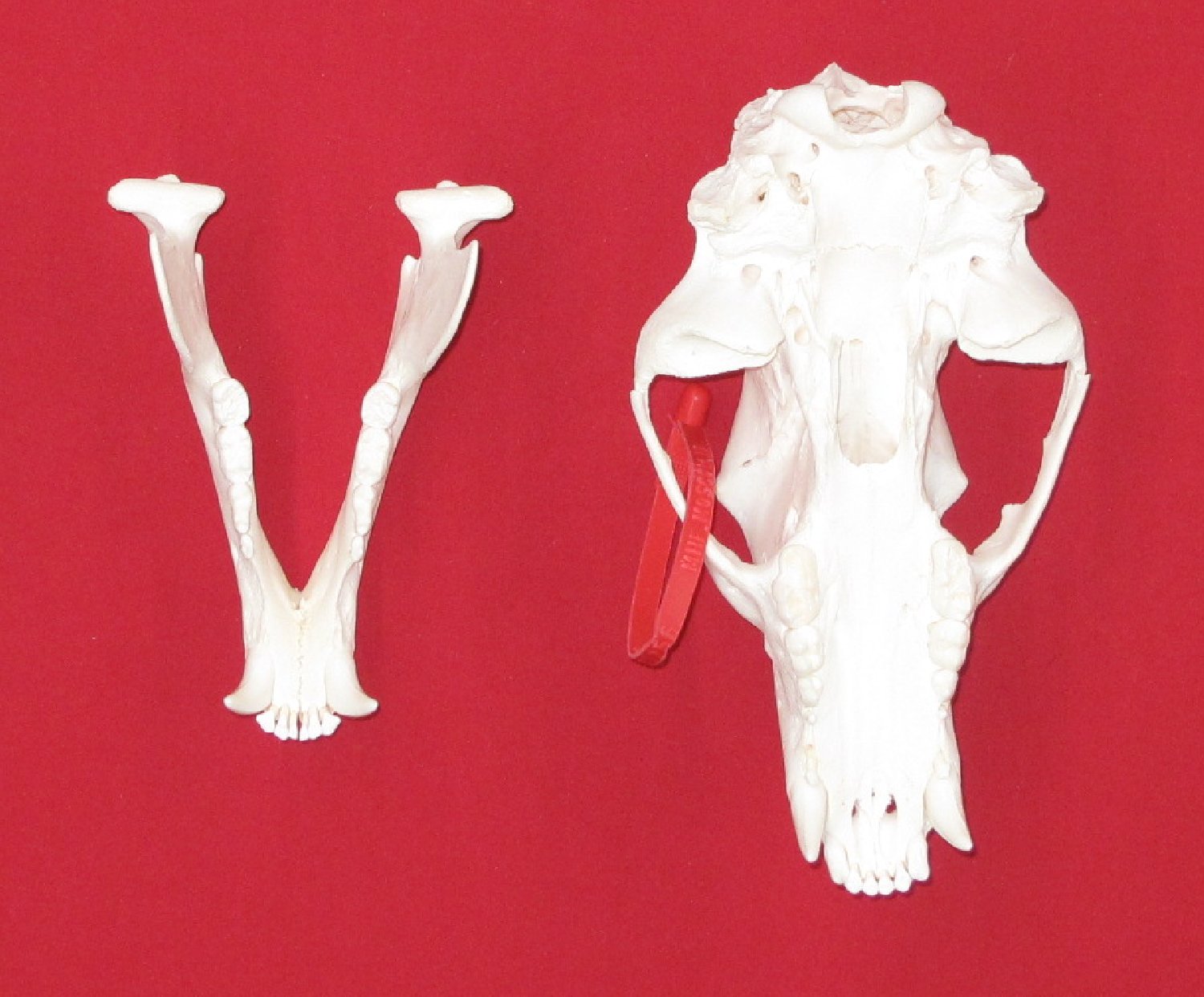 Lot # 5113-9724XL10.5-11" long professionally BEETLE CLEANED MUSEUM QUALITY #1 except lower extra small premolar each side, one extra small premolar upper left removed by Fish and Game for aging. Tag 21256. Nice extra wide skull $399.95 /eaF-27 |