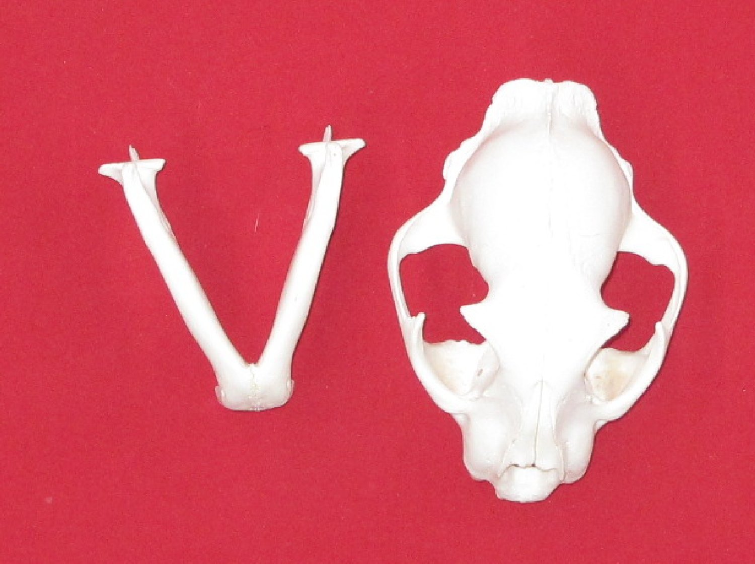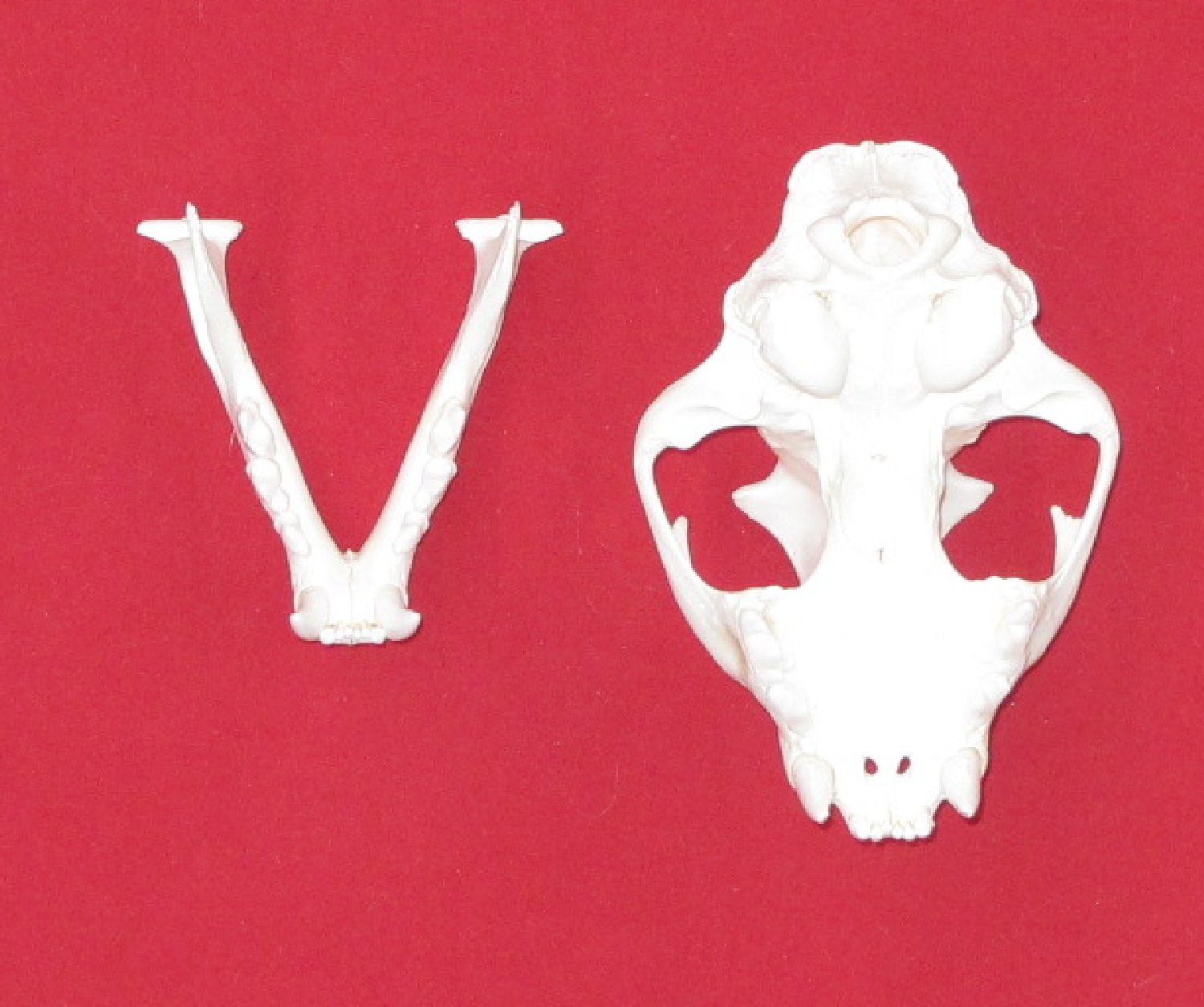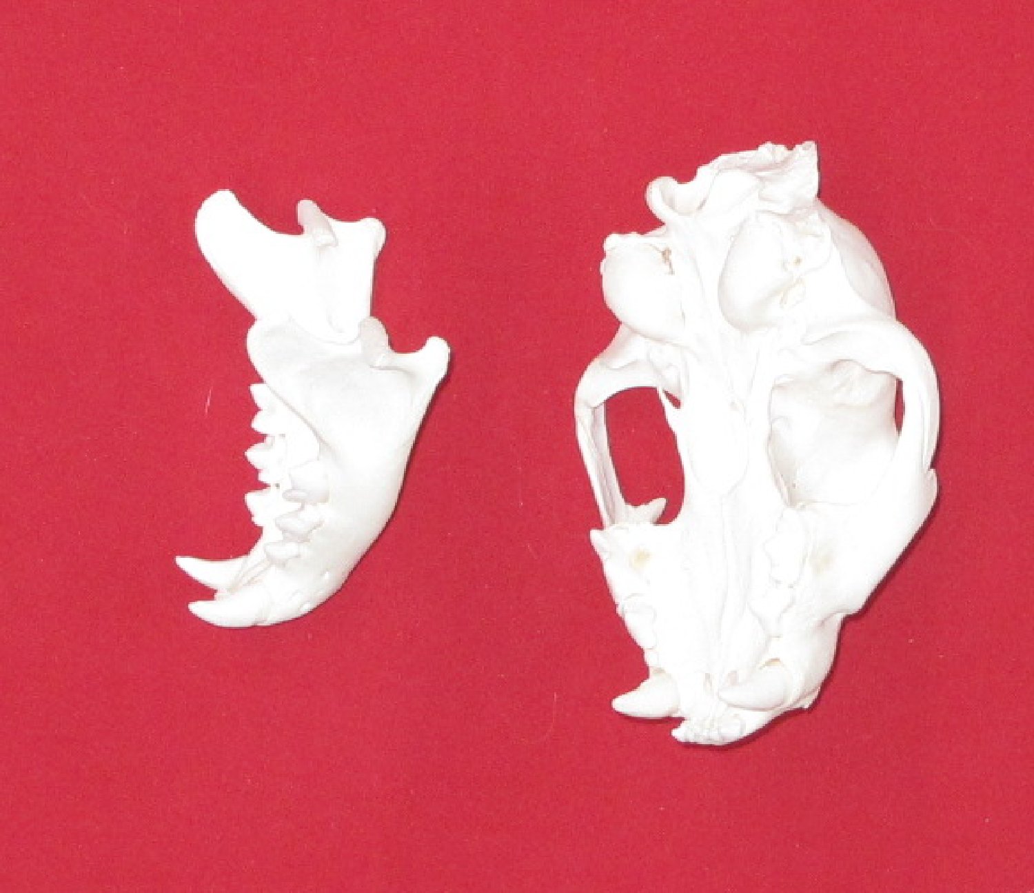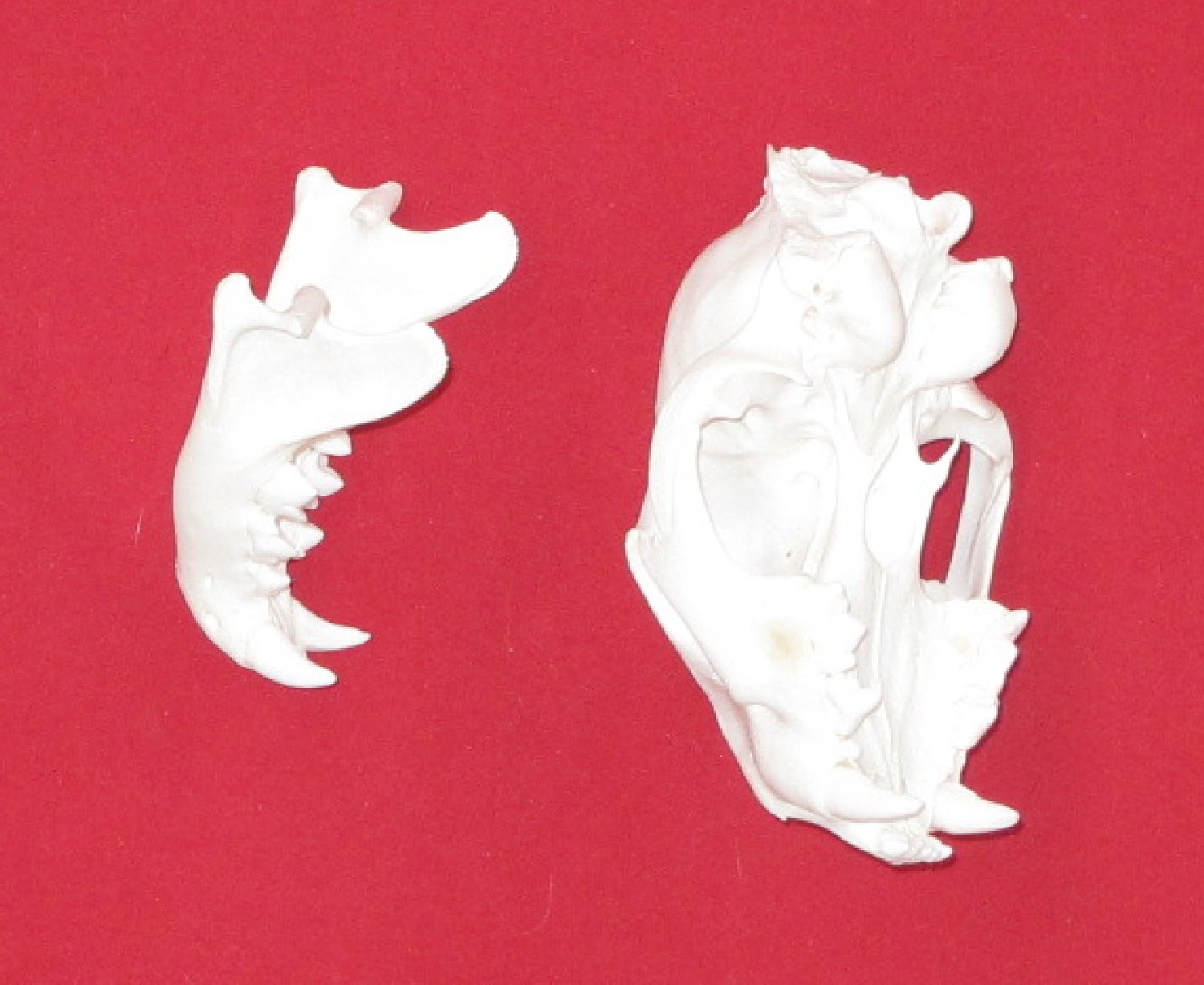 Lot # 5141-9825Small6.25-6.5" long professionally BEETLE CLEANED subadult animal, has adult teeth #1 except upper right premolar, extra small rear molar removed for aging; extra small chip off each upper canine. Nice skull $165.00 /eaF-27 |