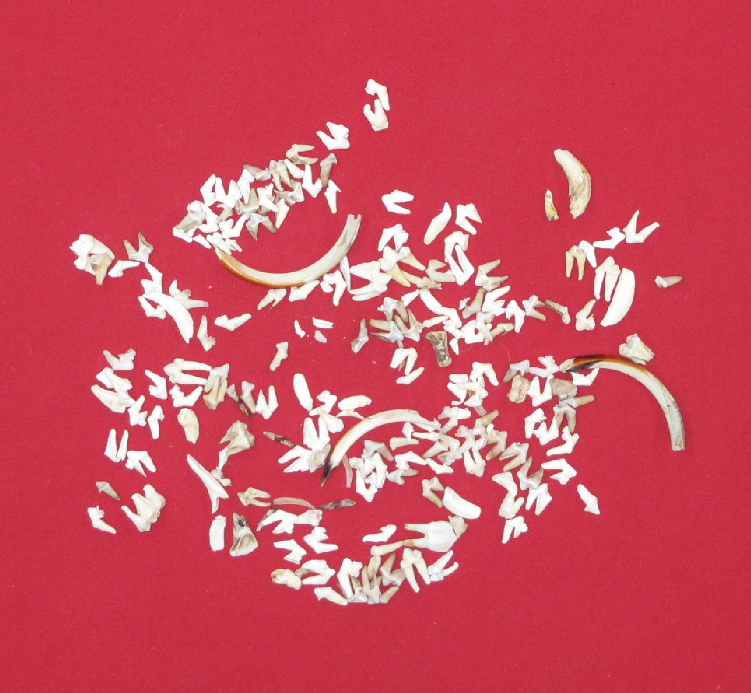 Lot # 5849-0078Misc. teethmostly premolars from cougar, bear, wolves some beaver, coyote etc. 1.99 oz/pkg mostly professionally cleaned damaged teeth $9.95 /pkgdoor, F-2 |