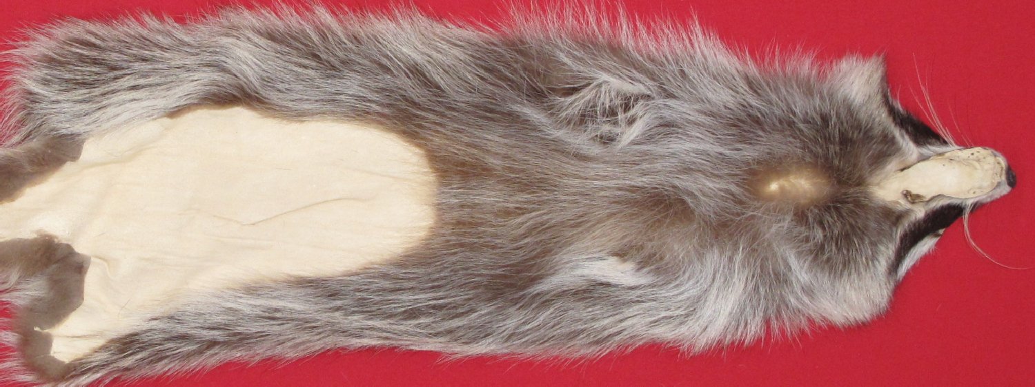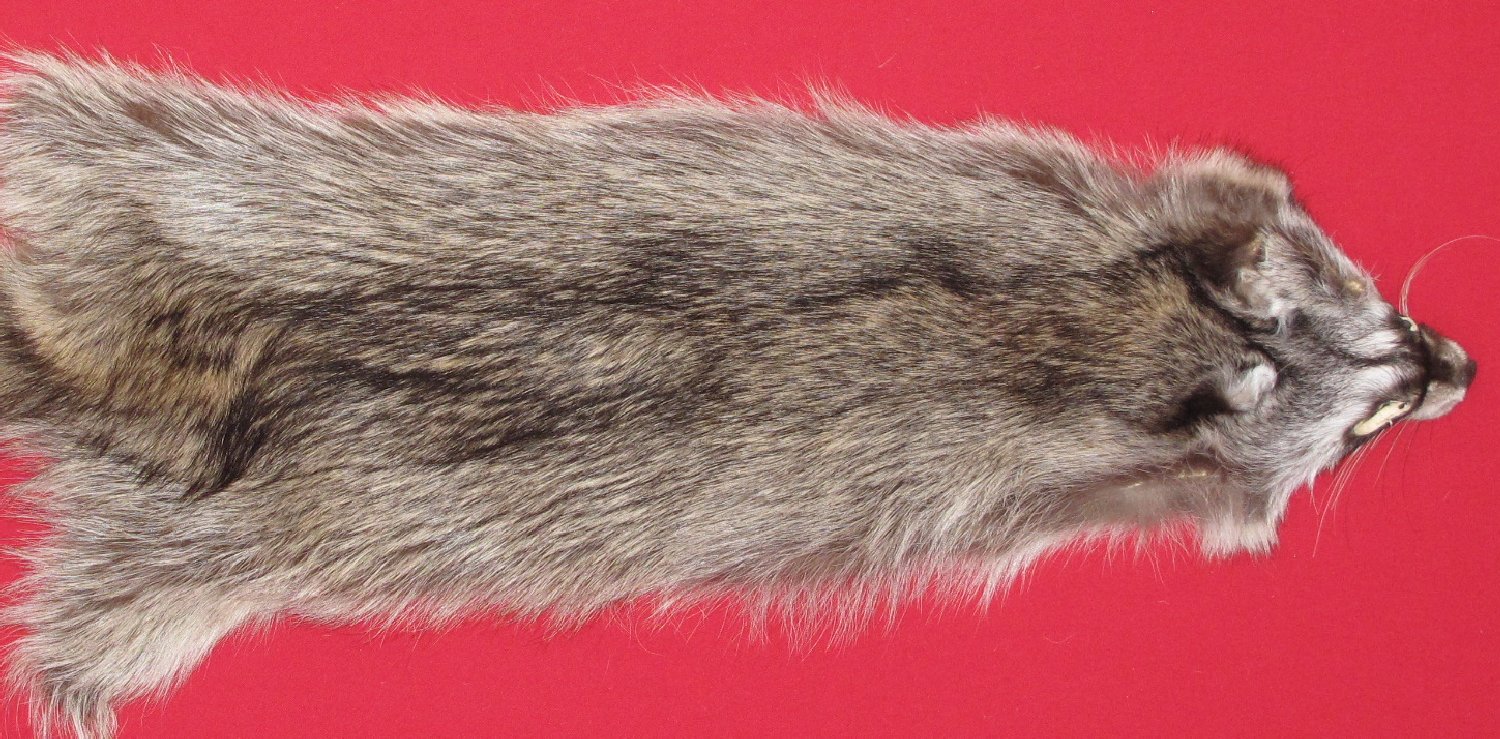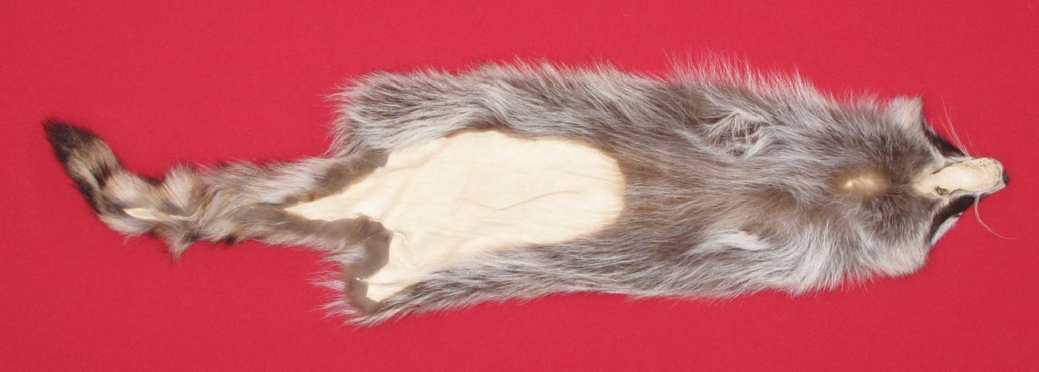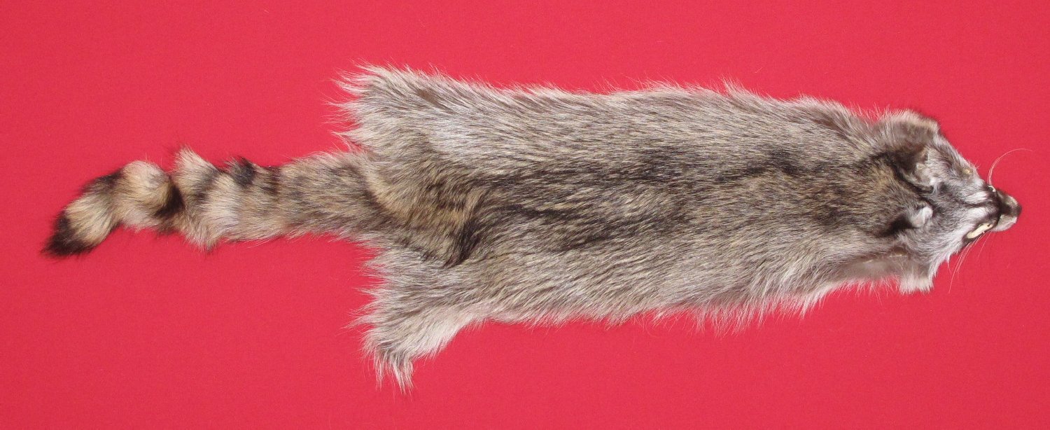 Lot # 7270-2355Northern Utah; Procyon lotor palliduslarge, 26-28" long plus tail; extra wide skin medium dark gray, black guard hairs extra super heavy winter fur cased #1 except leather very, very slightly damaged. Select quality fur. Beautiful skins. Extra silvery bellies $79.95 /eaFR-541 |