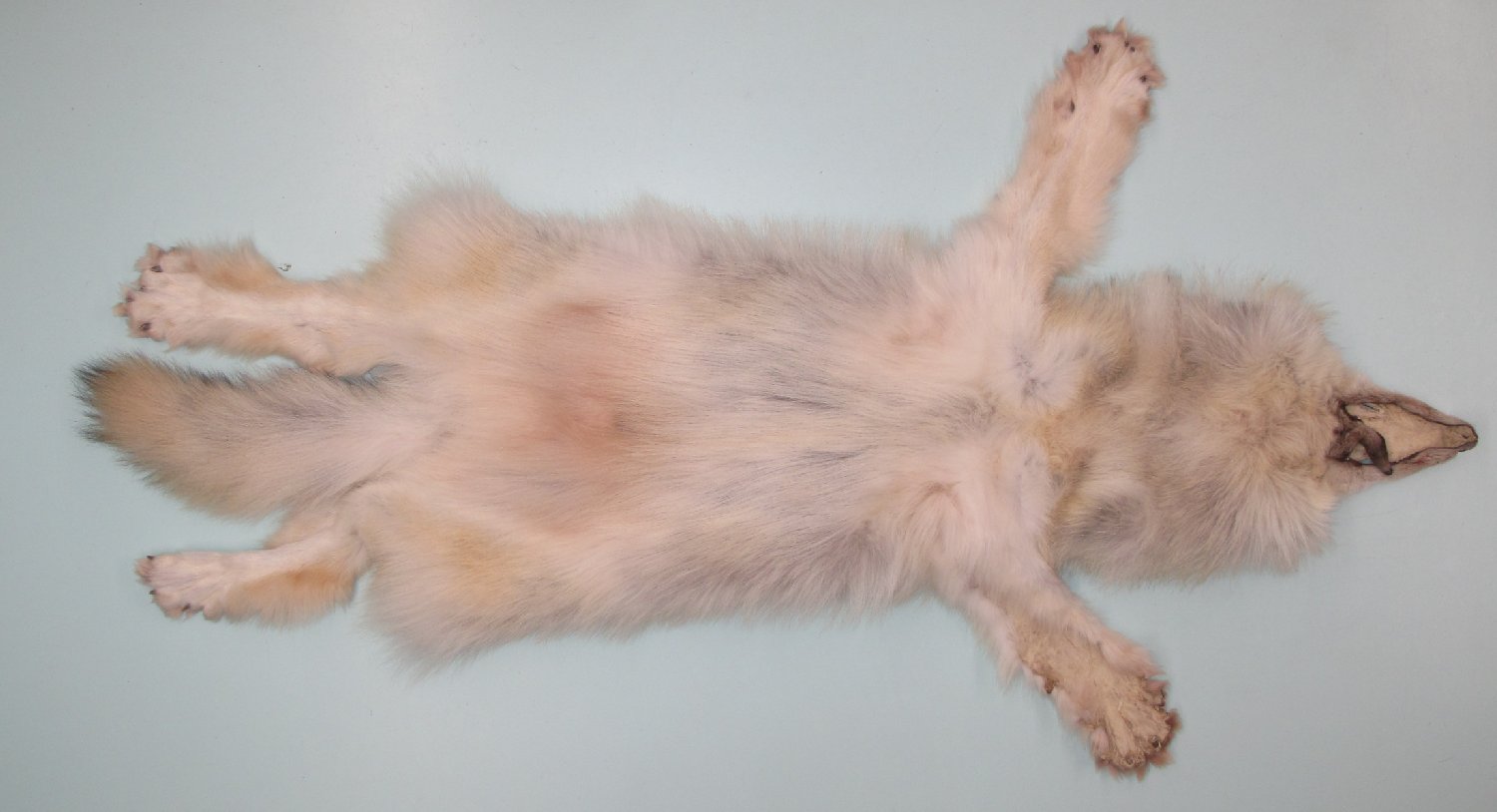 Lot # 7480-2544Canadian Taiga Country. Land of musk oxen, grizzly bear, caribou, and polar bears64" total length; NTB = 47"; super,super wide skin back pale to medium brown, black guard hairs some golden hairs on neck, flanks super, super, super, super heavy winter fur; cased subadult male animal. Was skinned by amateur, with result that has more knife cuts that normal. Would make a beautiful wall hanger etc. HAS FEET, extra small claws, no pads on feet. Gorgeous whitish belly. Repairable tear in outer edge of left ear. Multiple small to medium cuts in neck, lower abdomen. Extra wide skin. Few wolves with heavier fur $699.95 /eaBkskn Room |