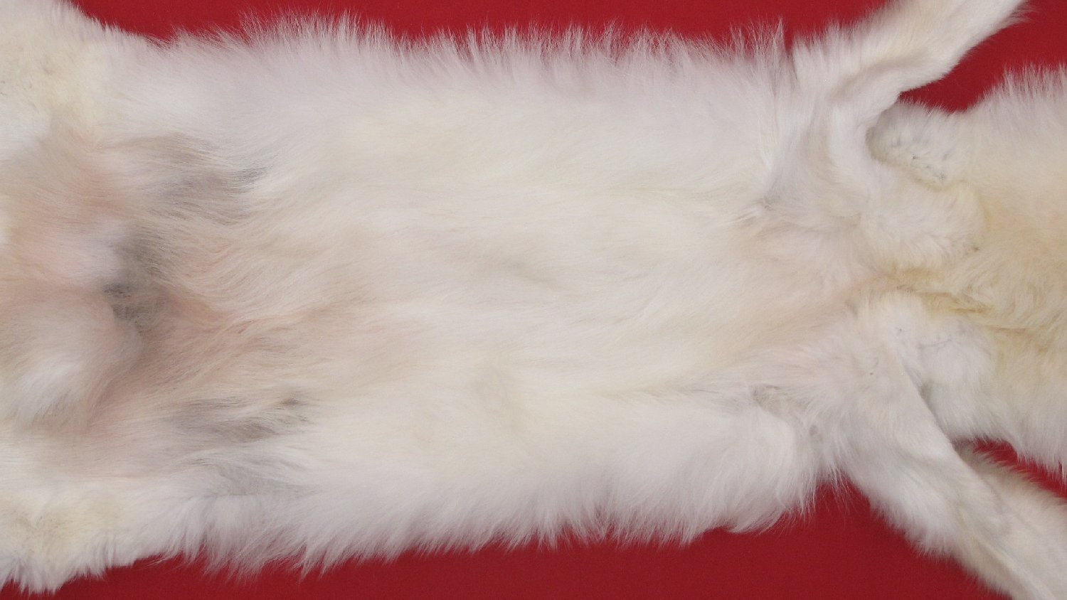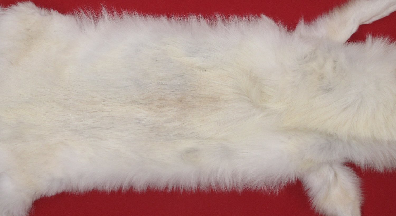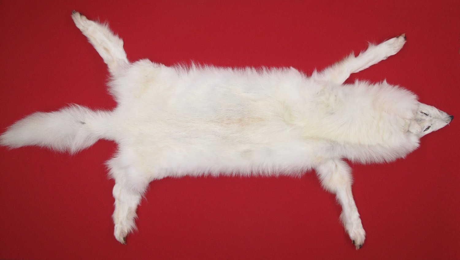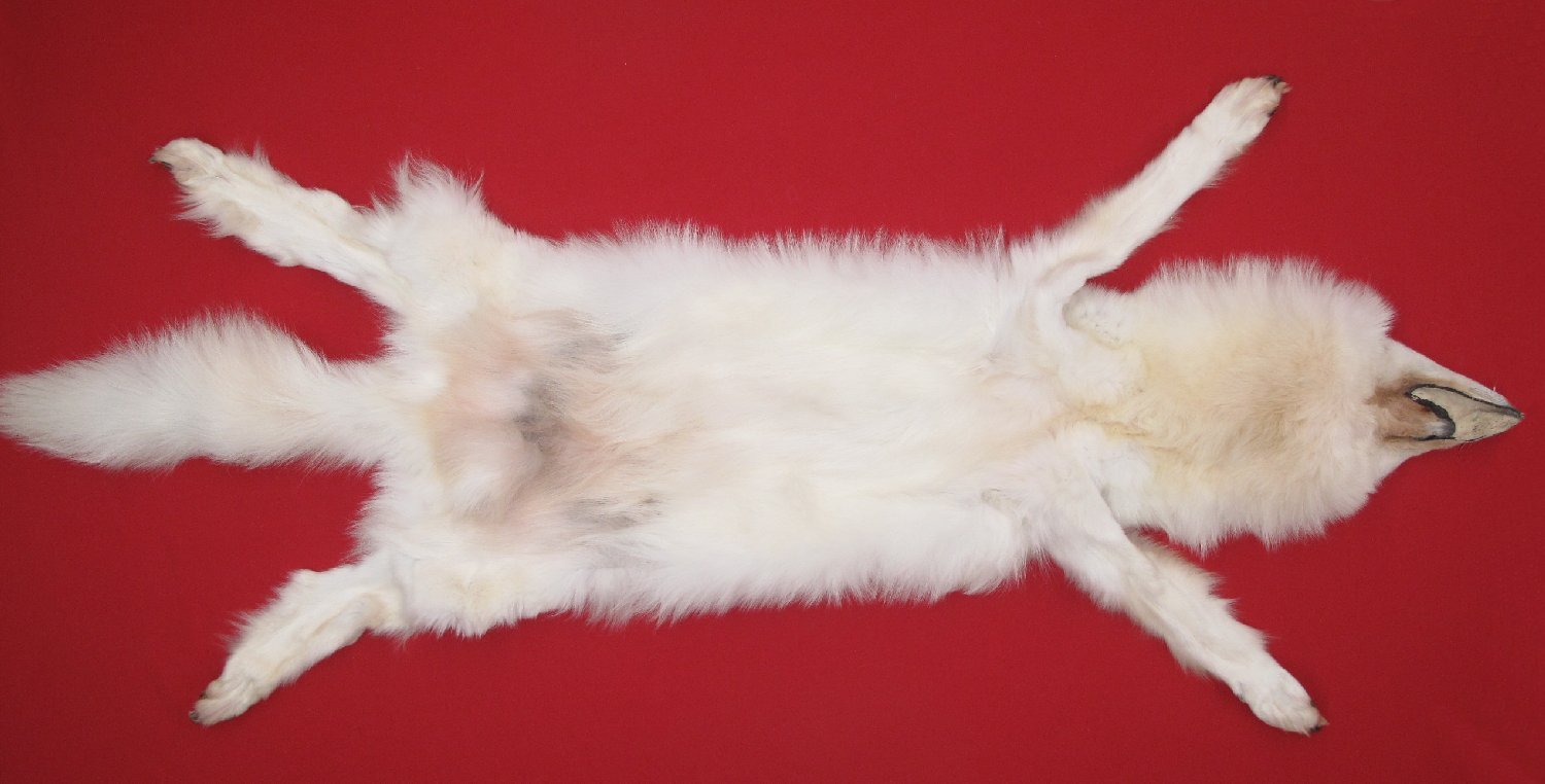 Lot # 7480-2549Canadian Arctic75" total length; NTB = 55; extra wide skin white (albino) with slight golden caste super, super super heavy winter fur underside of neck neck slightly golden; cased HAS FEET & CLAWS, cartilage removed from ears. inner lip removed (outer edge of lip present). #1 except leather slightly damaged (scattered small to extra small knife cuts, most sewn by hunter). Mature female. Has very, very vew black hairs on back. Gorgeous select quality fur. Golden brown claws. Beautiful skin $999.95 /eaBkskn Room |