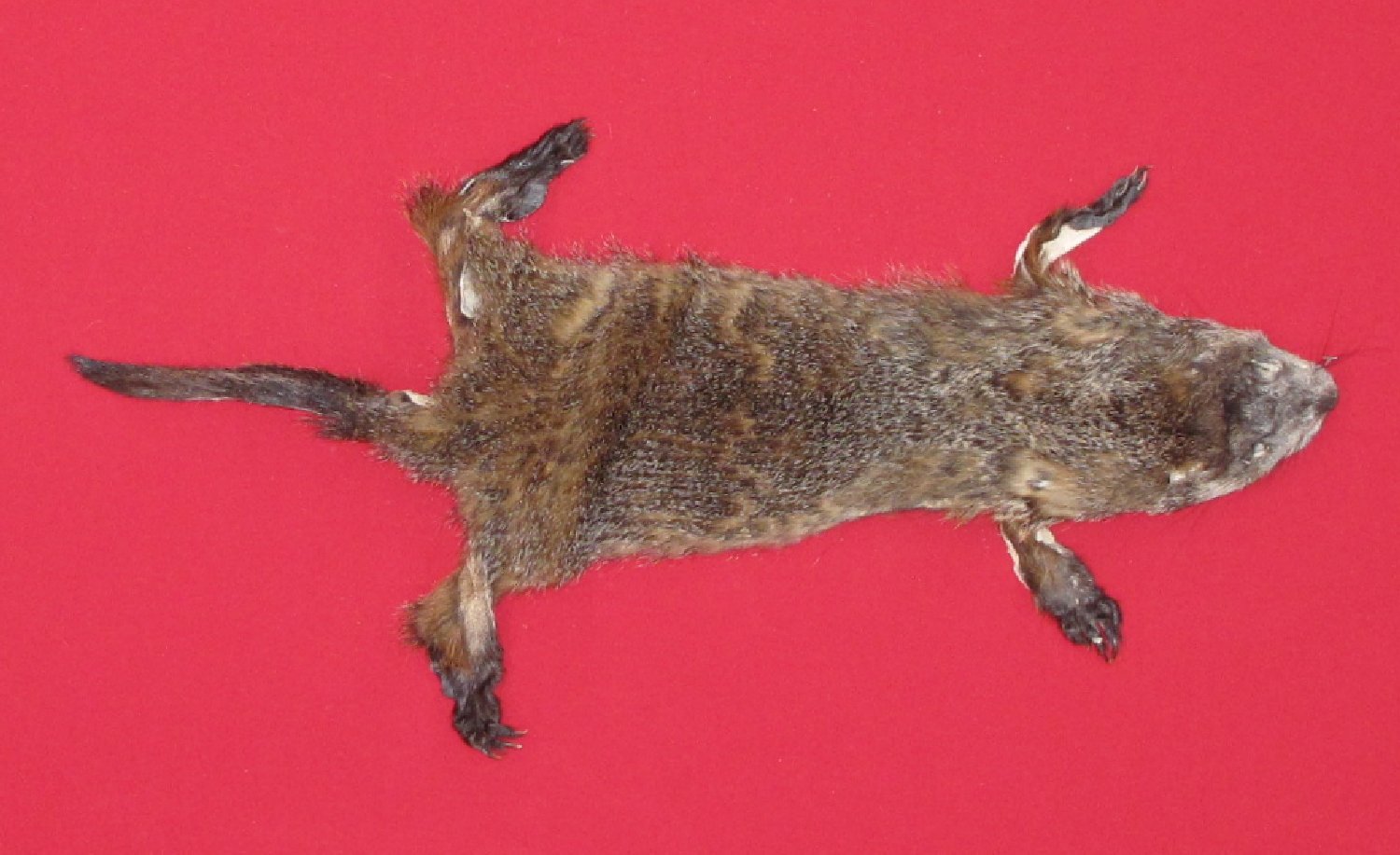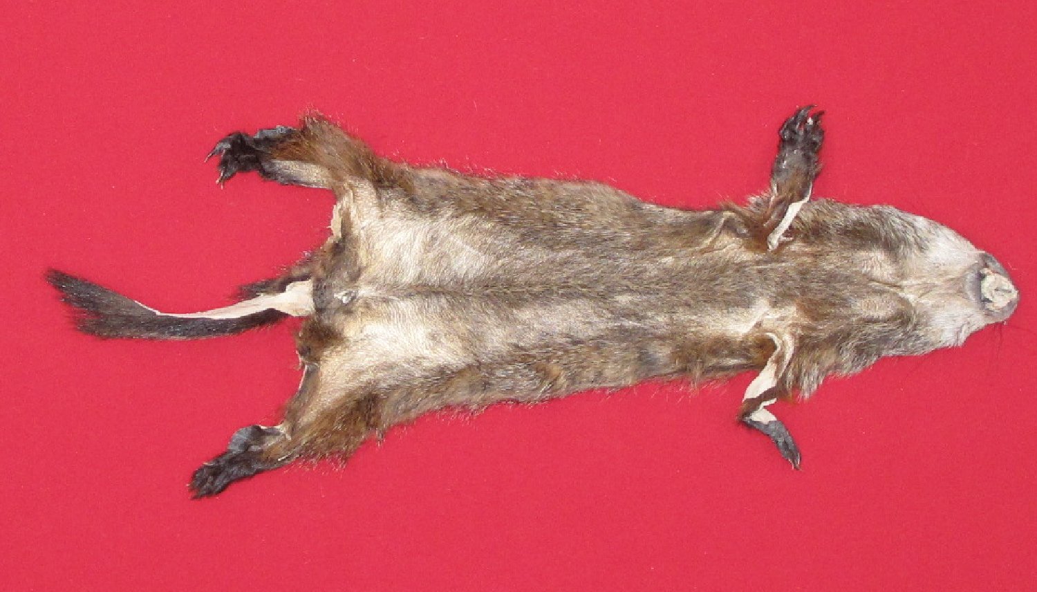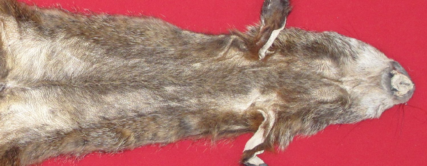 Lot # 7526-0056Eastern. Marmota moax18-19" long plus tail brownish color, dark bronze underfur golden tipped guard hars extra heavy spring fur; cased HAS FEET & CLAWS, ears turned, lips split, etc. #1 except pea size bare spot on right shoulder quality. SUITABLE FOR LIFE-SIZE. Female; fur on abdomen thin $99.95 /eaFR-531 |