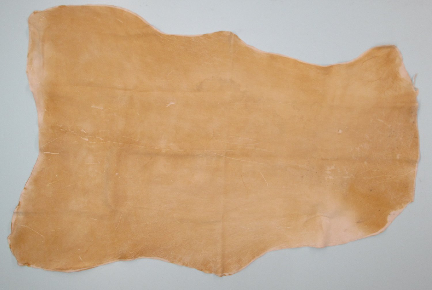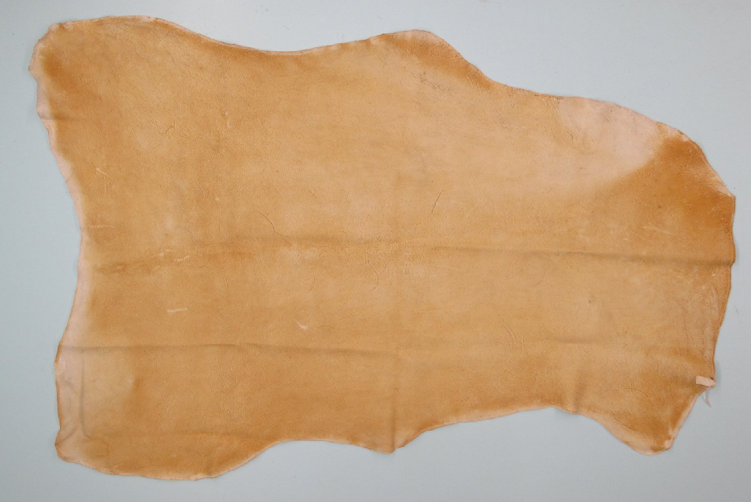 Lot # 780-0264Eastern white-tail deertanned by hand, smoked. Complete hide. Cut off at base of neck; 48" long, ~9.25 sq. ft. #1 except scattered dark brown extra small spots on anterior ~14" of hide; of outer surface of hide; has multiple scars on outer edge of hide. Inner surface of hide nice; very few scars on inner surface of hide $499.95 /eaBkskn Room |