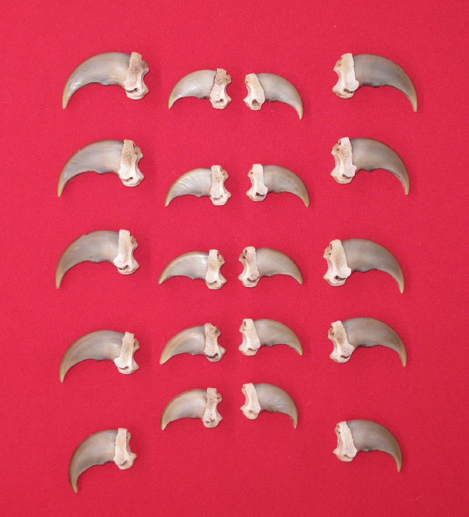 Lot # 2736-9972XXLlargest claws 2.75-3" long 1 set = 20 claws; light gray color slight reddish brown on dorsal side, tips from same animal, hair removed, dried #1 quality $437.50 /setF-30 |