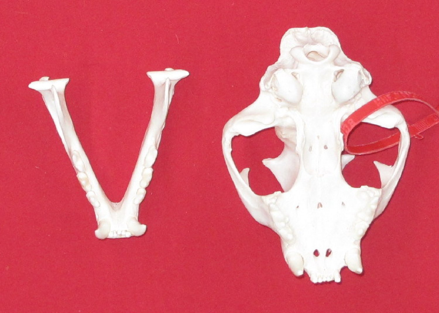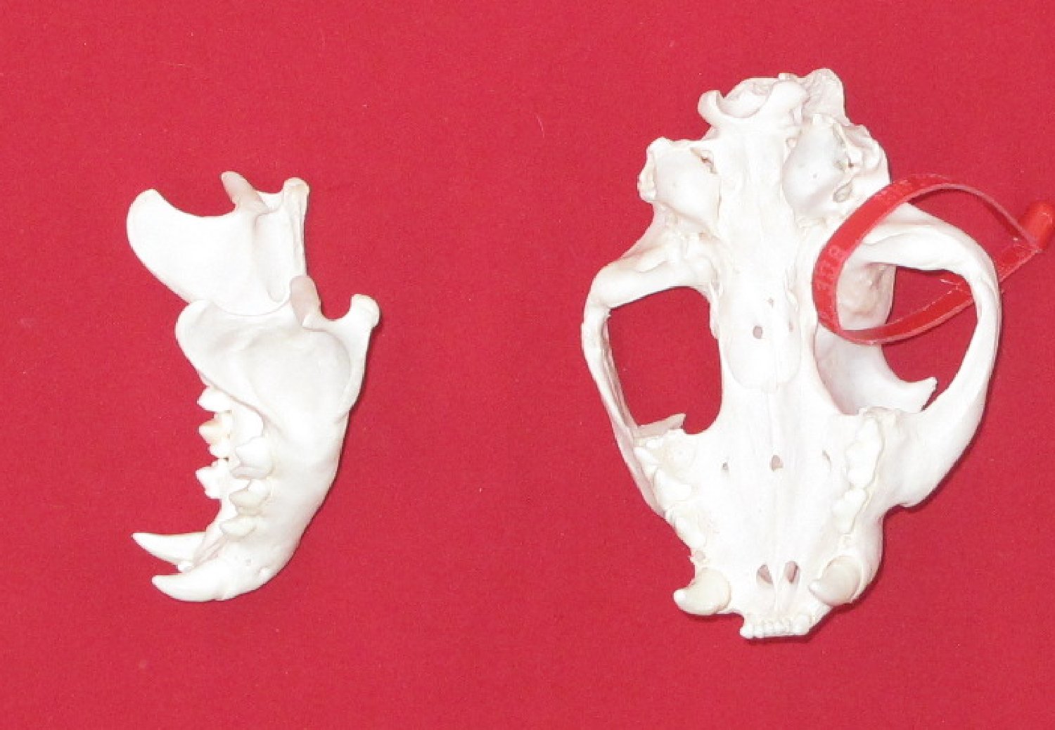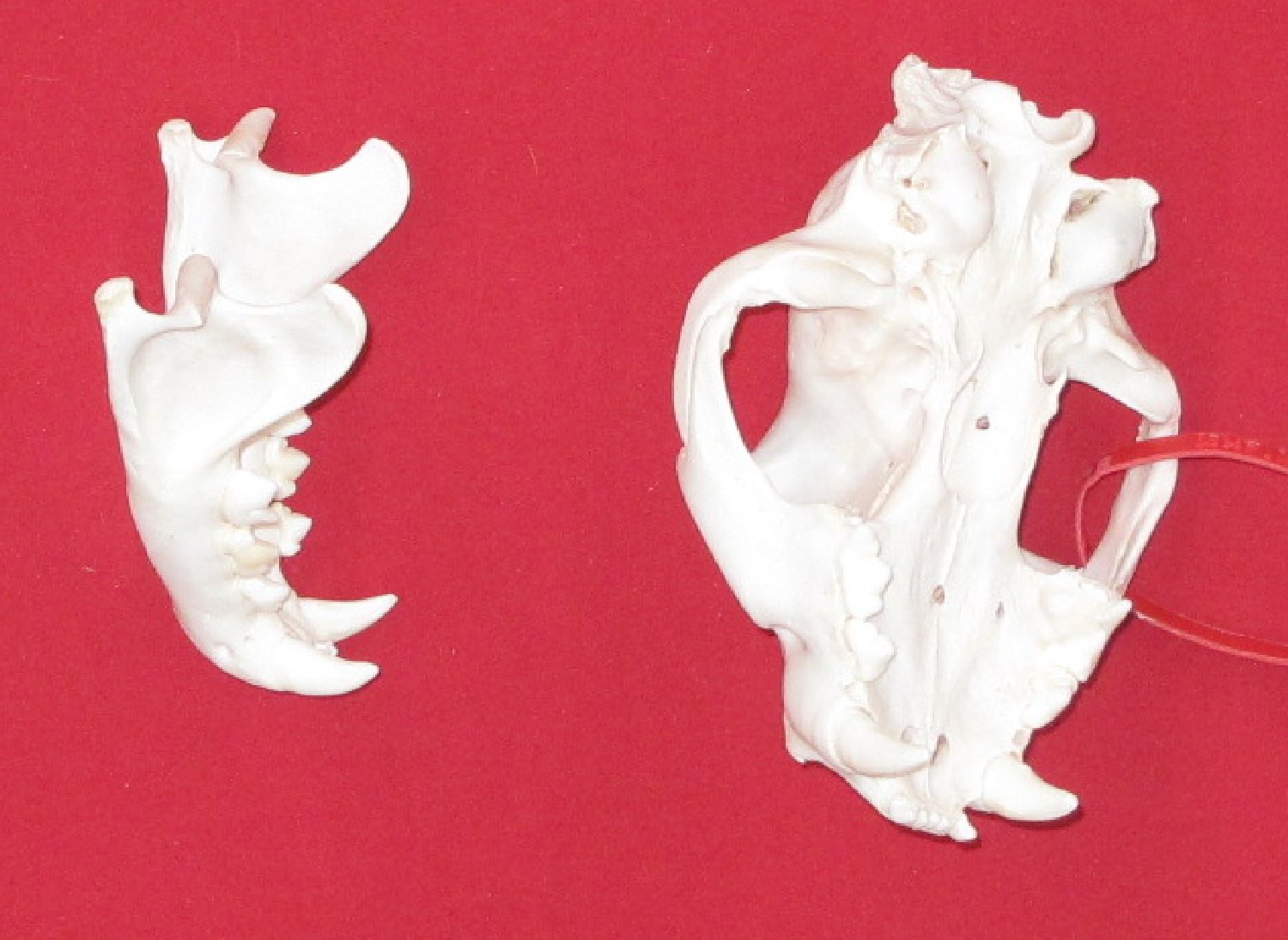 Lot # 5141-9820XL7.25-7.5" long professionally BEETLE CLEANED mature female prominent sagittal crest upper right, upper left anterior premolars (P-1) removed for Fish and Game Department for aging. #1 select quality. Nice skull $499.95 /eaF-7 |