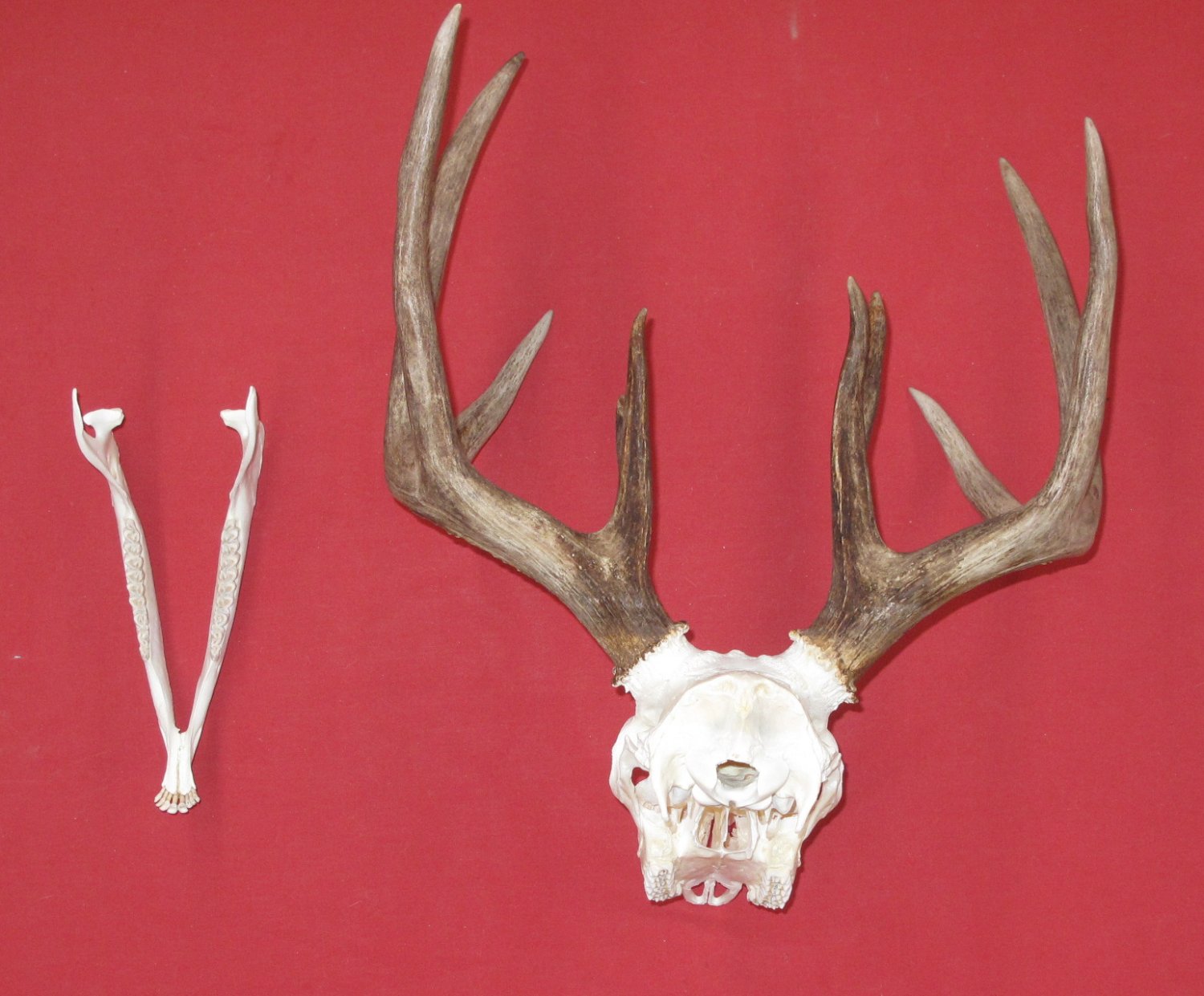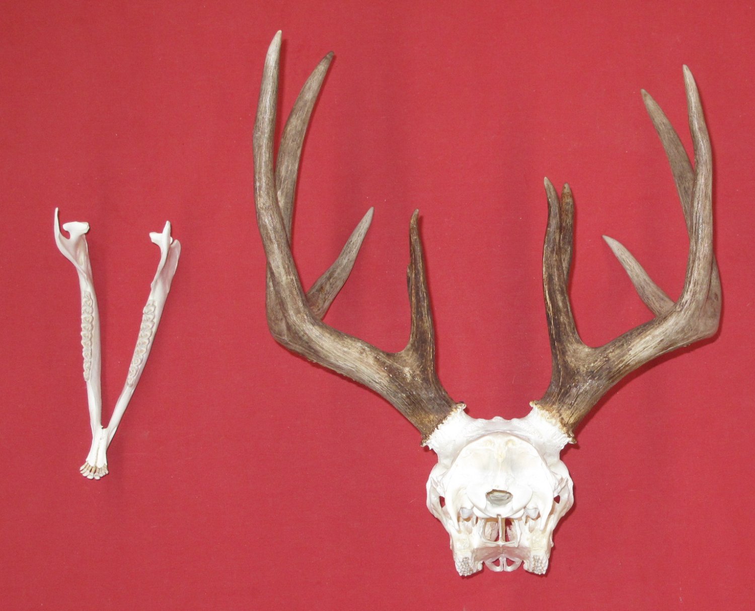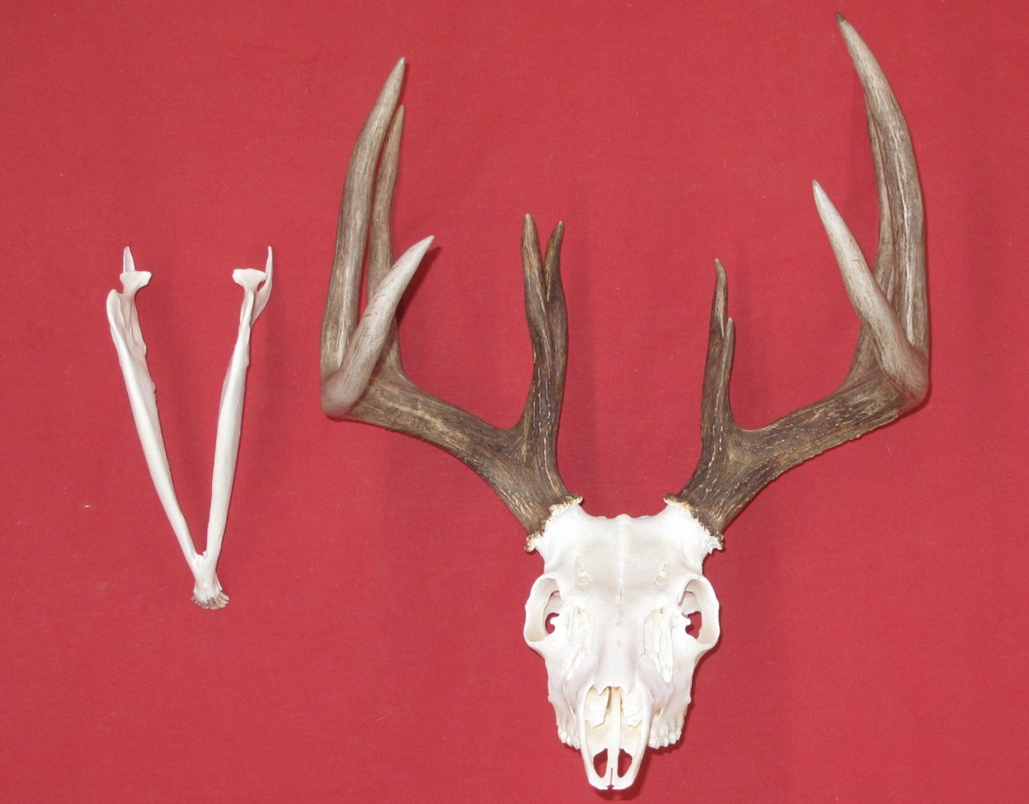 Lot # 5152-0400Buck, complete skullprofessionally cleaned XXL 11.5-12" long 5x5 antlers small fork on left brow tine less than 1", so technically a 5x4. Gross BC score ~128.25. Right: Main beam 17.5; tilnes 6.5, 7.75, 8.25; beam 4.5, 4, 4, 2.5. Fork off G1 2.75". Left: Main beam 18; tines 5.25, 9.5, 9; beam 4.5, 4.25, 4.25, 2.5; inside spread 13.25. Extra super heavy; hard fresh brown. Matched 5x4. #1 select quality. Beautiful skull. Exceptionally nice. Tag 21081 $350.00 /eaF-12 Quantity Available: