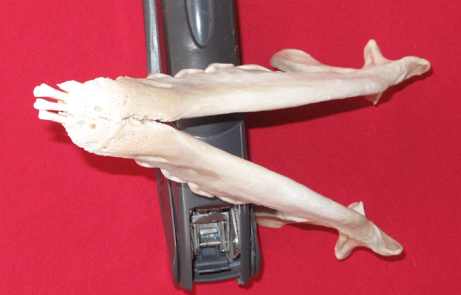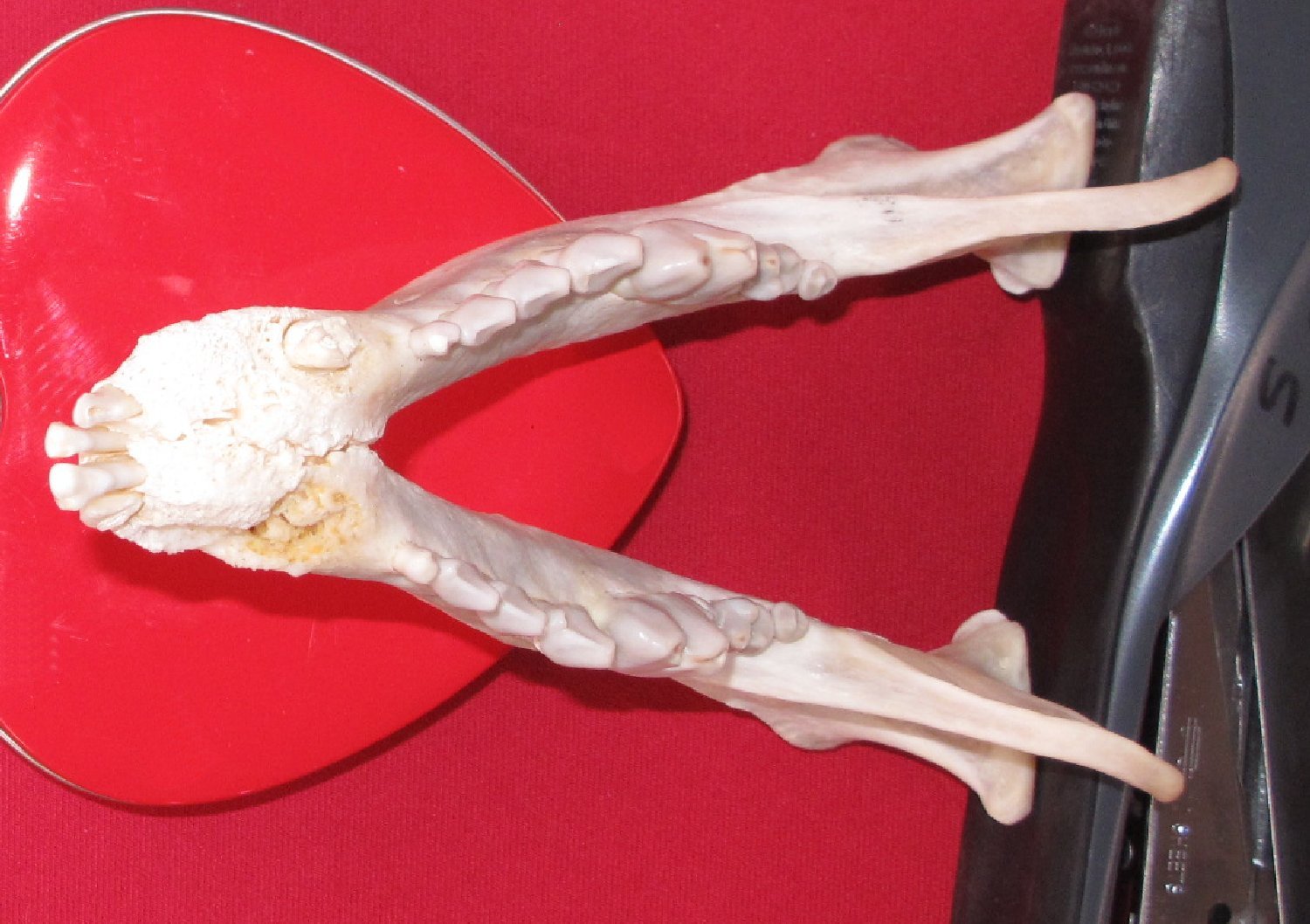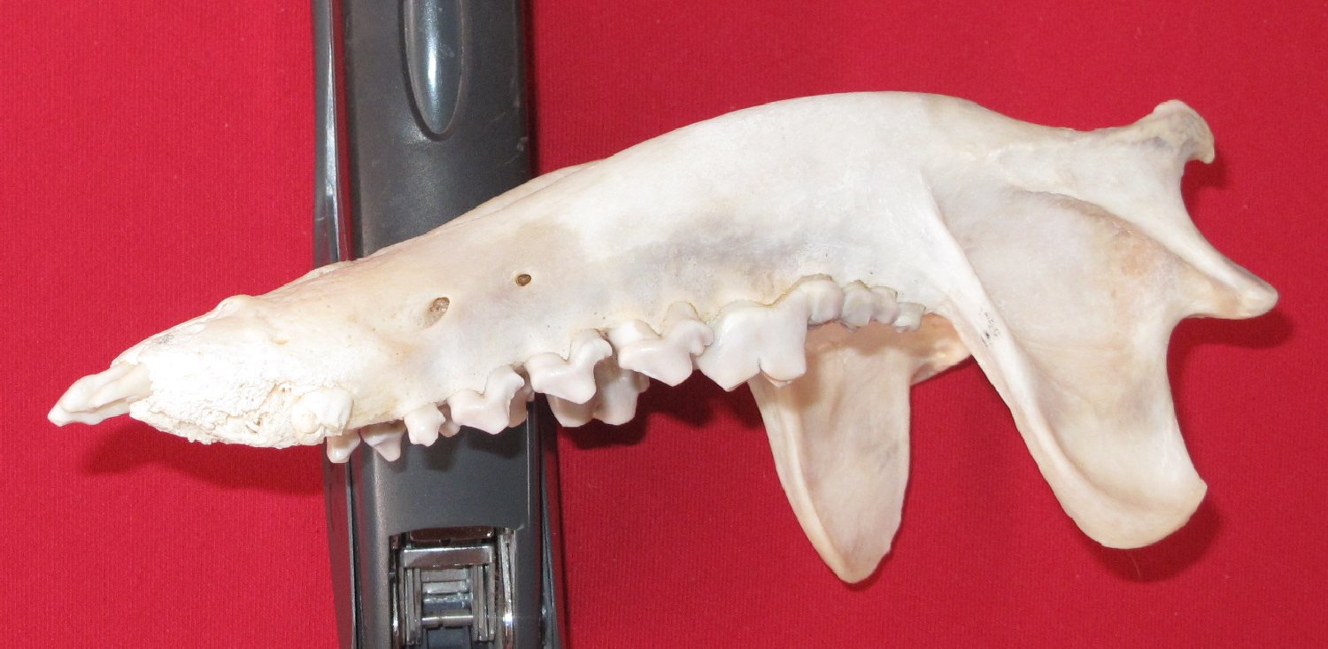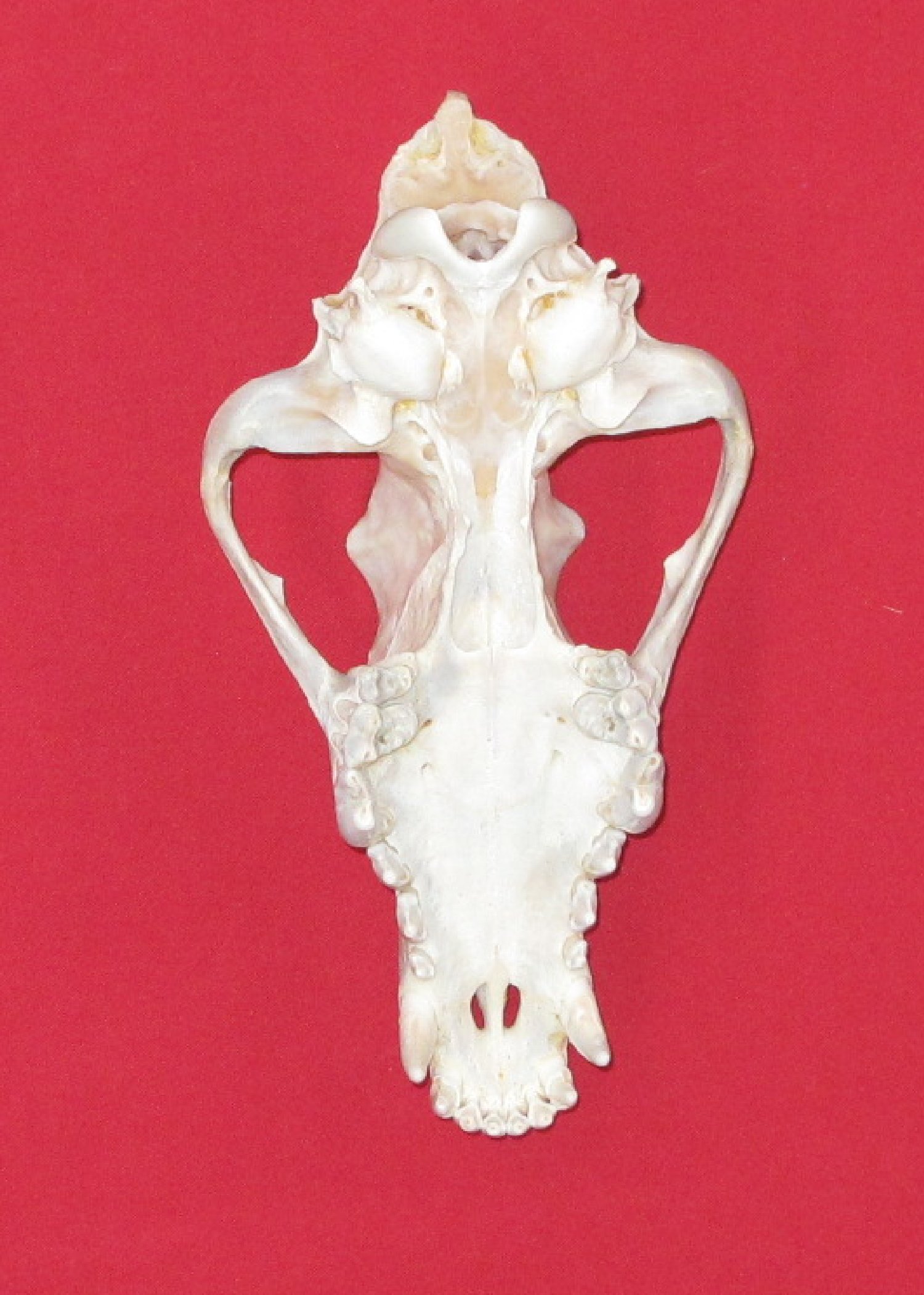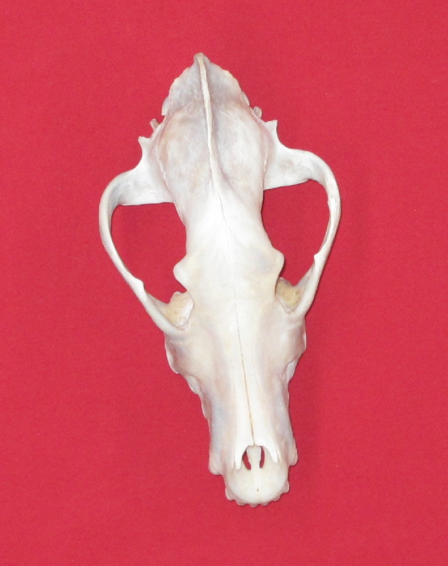 Lot # 5291-9856AlaskanXXXL 10.75" long professionally cleaned older animal, teeth very slightly worn #1 except lower ~2.5" of lower jaw was broken (maybe broken from moose kick, etc.) Both canines broken off; has four center incisors remaining, two outer incisors broken away, roots and all; tips of two incisors broken. Broken bone is in the "callous" stage which forms shortly after the break. The callous will hold the broken parts together while the break is calcified and grows hard. The entire healing process may take up to a year. Good skull for schools, collections, labs etc. Upper skull #1 quality. $499.95 /eaF-7 |