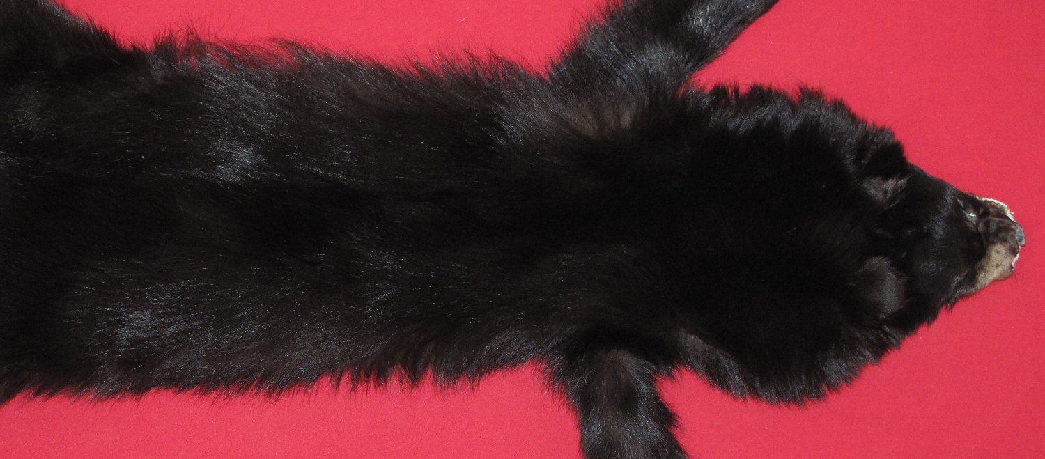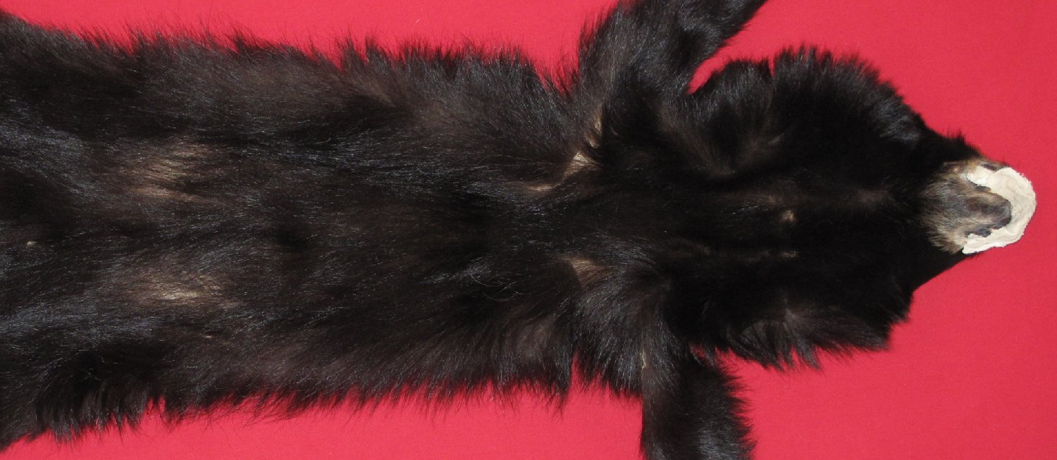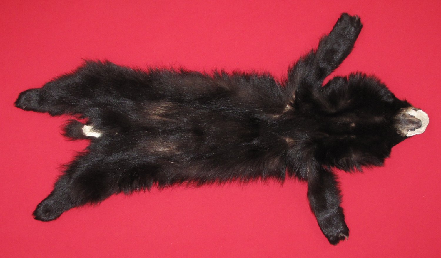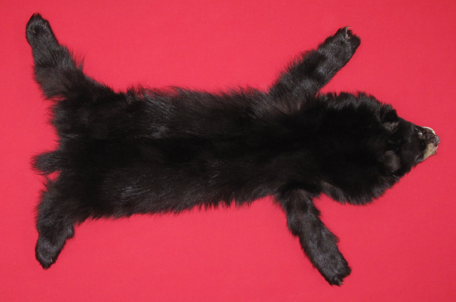 Lot # 6105-1037Canada43" total length; NTB = 38 black; brown, dark brown snout super, super, super thick spring fur to ~3.5" long CASED HAS FEET & CLAWS, ears turned, lips split, etc. #1 except ~3.5 hunter sewn cut in abdomen between front legskins; ~2.5" easily repairable cut in upper left legskin. SUITABLE FOR RUG OR LIFE-SIZE. Exceptionally nice fur on this bear. Beautiful skin. Hard to find bears this small. Canadian auctions might offer 6-8/thousand skins. $850.00 /eaR-241 |