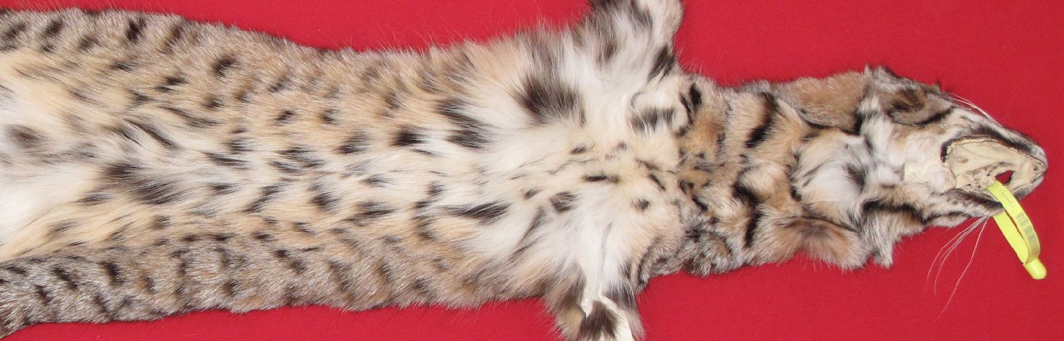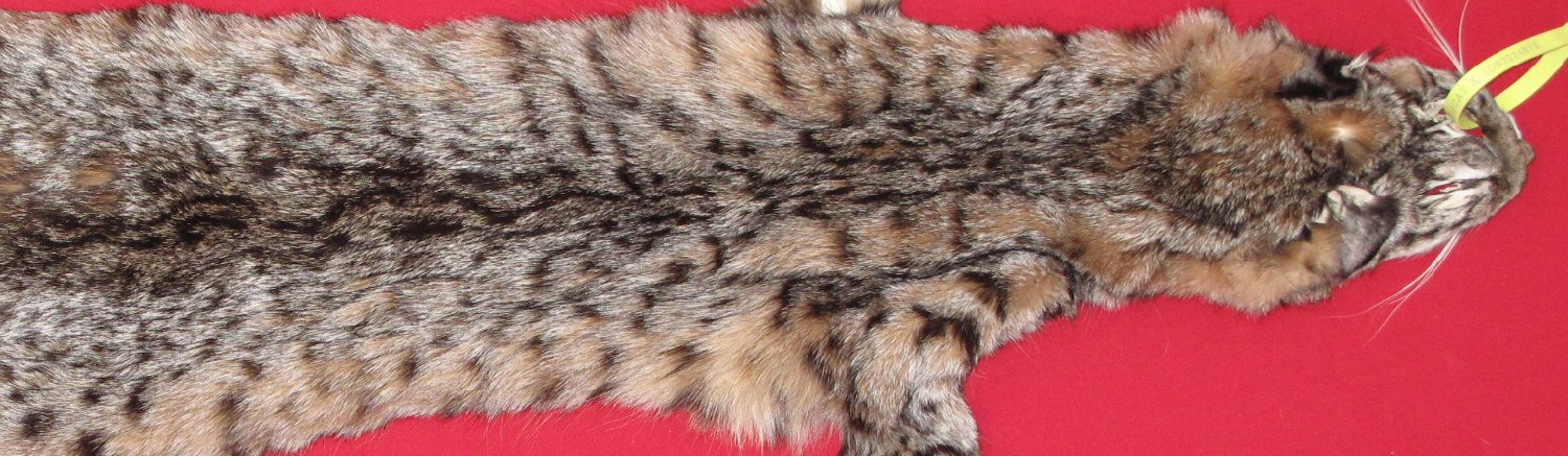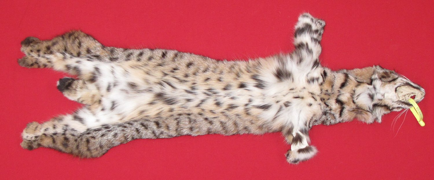 Lot # 6205-1350Idaho31" long plus tail extra dark blackish brown; superior spotting white spotted belly, some brownish hairs super, super heavy winter fur; cased #1 except base of right ear mostly bare; left legskin mostly bare; ~1.75 " x up to ~3/4" bare area just anterior of base of tail, ~1.5 x 1" bare spot in area of lower lip; ~3/4"cut and BB size hole in this area. Looks like jungle cat, spots and lines everywhere. Beautiful skin $250.00 /eaFR-244 Quantity Available:
