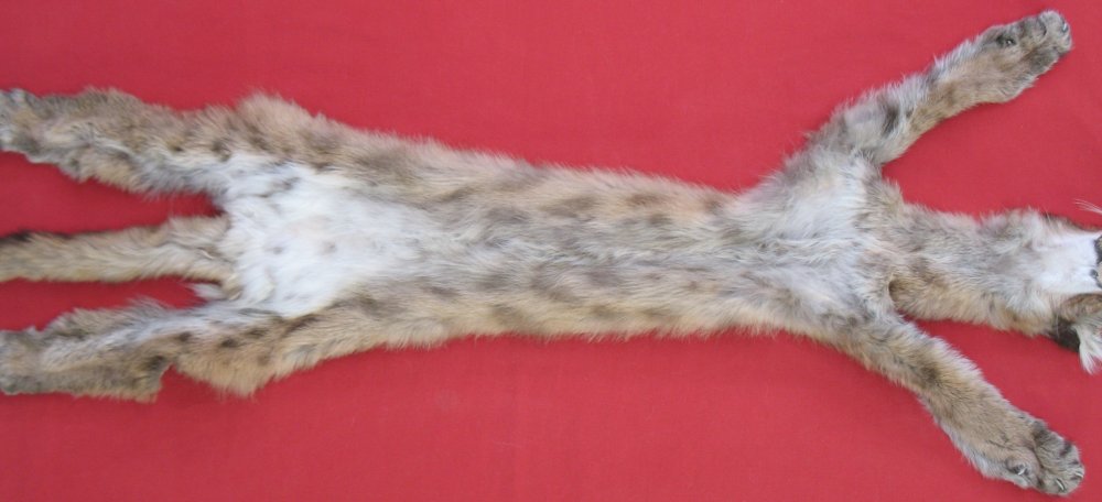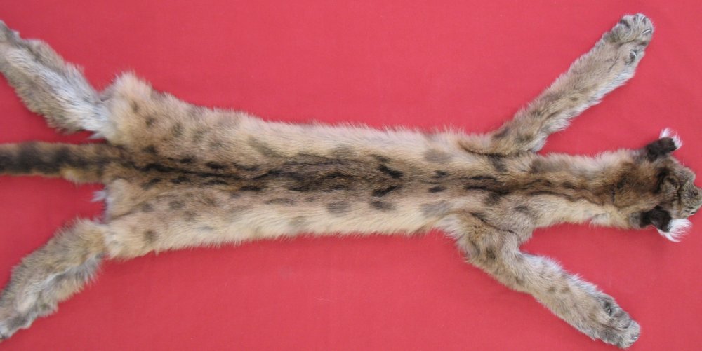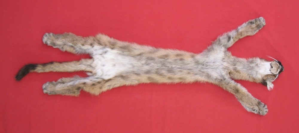 Lot # 6340-0528Idaho; KITTEN48" total length; NTB = 33" reddish brown with spots and lines on back super heavy kitten type fur cased tanned by Moyle Mink & Tannery. HAS FEET & CLAWS, ears turned, lips split, etc. #1 except easily repairable half dollar size hole in abdomen; otherwise leather very, very slightly damaged. SUITABLE FOR RUG OR LIFE-SIZE. Gorgeous cat, spotted like jungle cat. We purchased this at a Fish and Game salvage sale. Be sure your state laws allow you to have this. EXTREMELY RARE SPECIMEN $2000.00 /eagjs office Quantity Available: