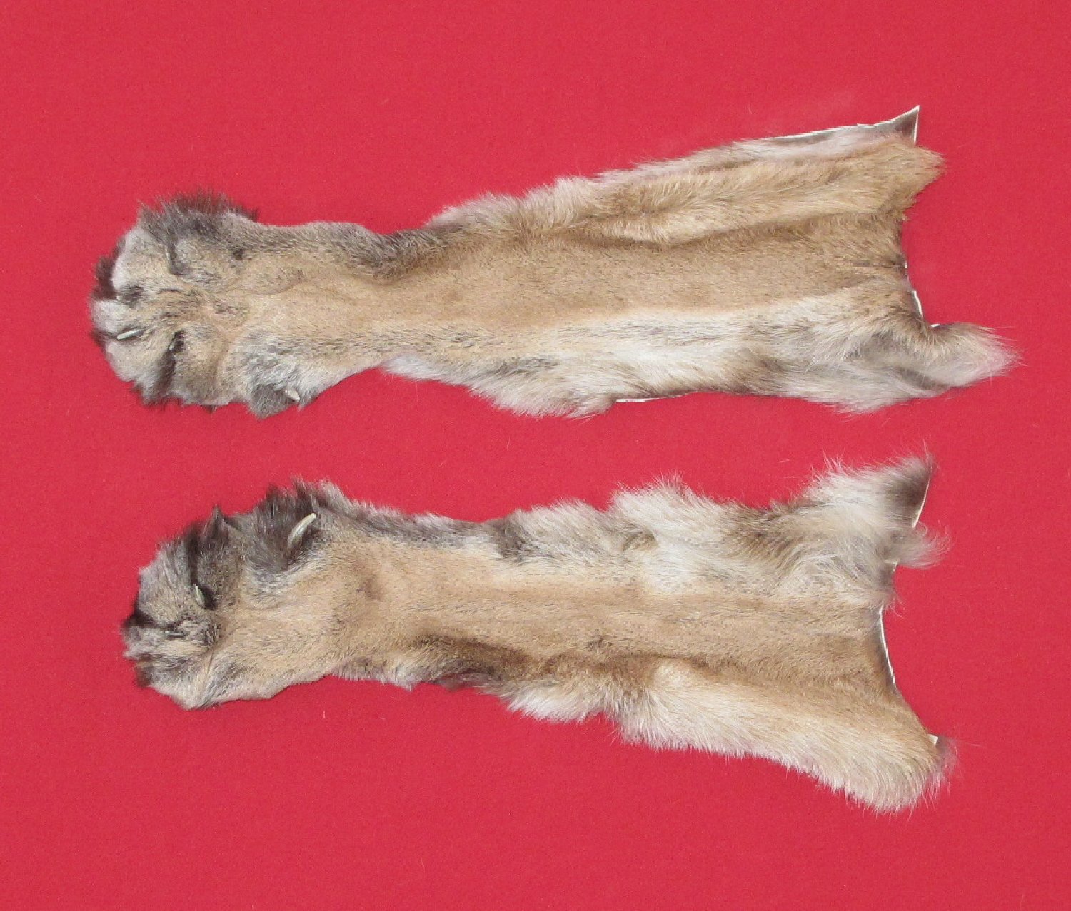Lot # 6345-0414Idaho; front feet and legskins with claws13-15" long; from 75" long skin medium light color November quality fur cut along backside #1 select quality. From same animal as lot 6345-0414. Can specify if you want left or right $187.50 /eaFR-411 |
