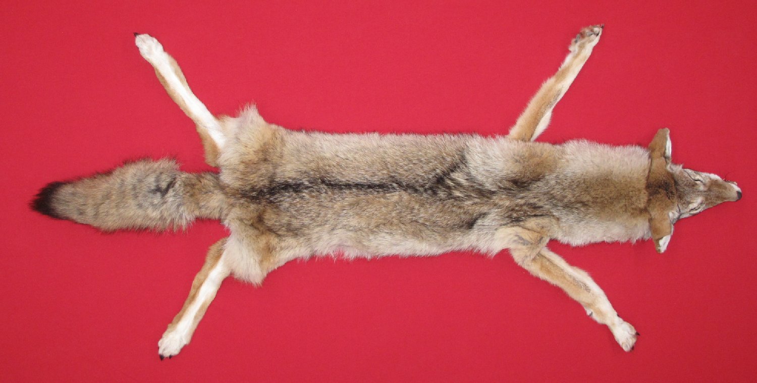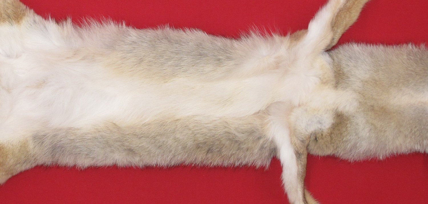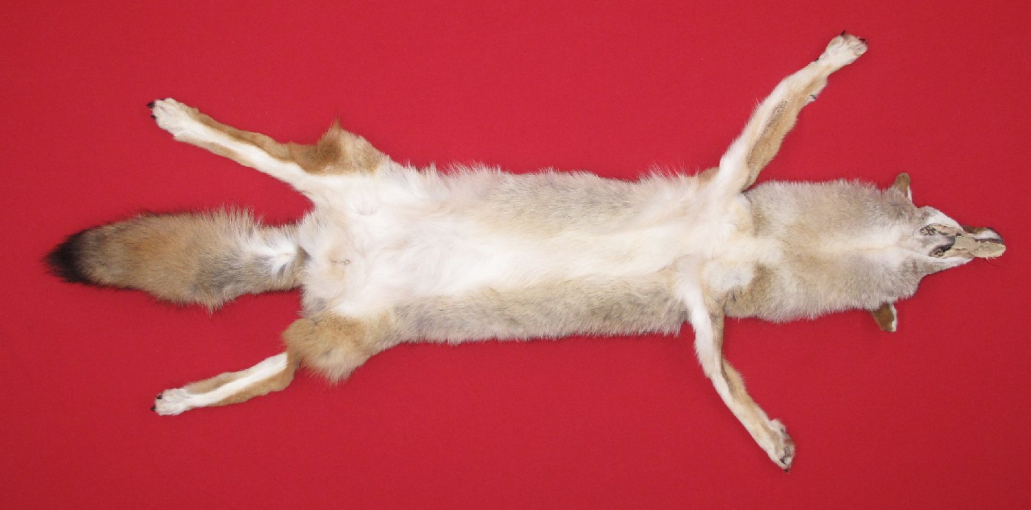 Lot # 6352-1217Northern Idaho Palouse CountryXXL, 40-42" long plus tail medium light brown color super, super heavy winter fur cased HAS FEET & CLAWS, ears turned, lips split, etc. #1 except ~7/8" easily repaireable cut in posterior abdomen; ~3/8" and 1/2" repairable cuts in upper left rear legskin; ~3/4" cut in leather in abdomen just posterior of left front legskin; two BB size holes where flesher cut base of anterior teats (mature female). SUITABLE FOR RUG OR LIFE-SIZE. Exceptionally nice select quality skin. Extra beautiful $275.00 /eaFR-212 |