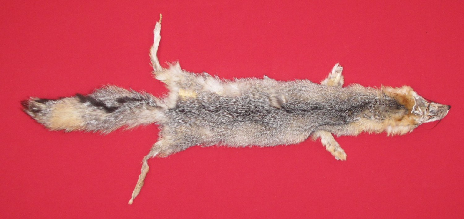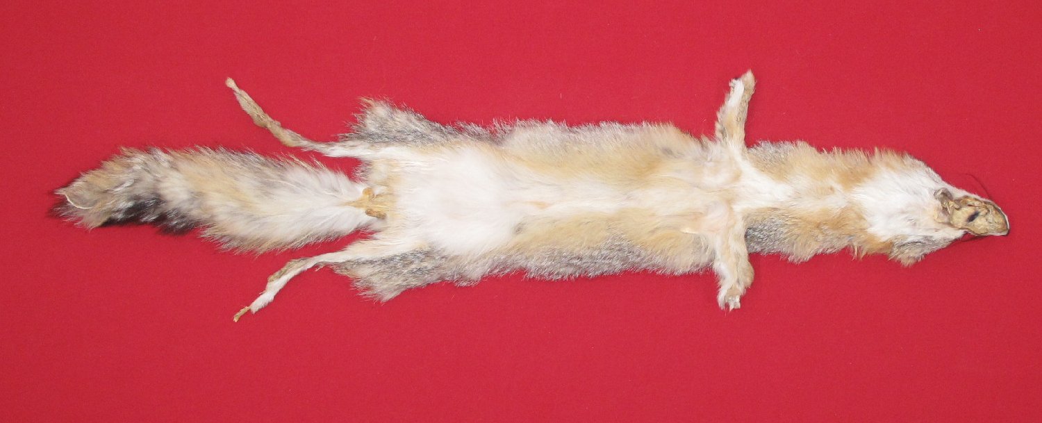 Lot # 6750-1076SouthwestXL, 28-30" long plus tail medium light color; nice whitish belly super heavy winter fur cased commercial type older tan, will tear easily. #1 except left hip mostly bare; scattered bare spots on left f;lank, right hip area, base of tail. Tip of tail bare. Good for fly-tying. $22.50 /eaArea 51 |