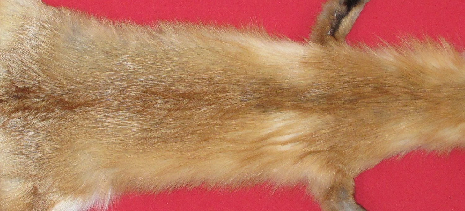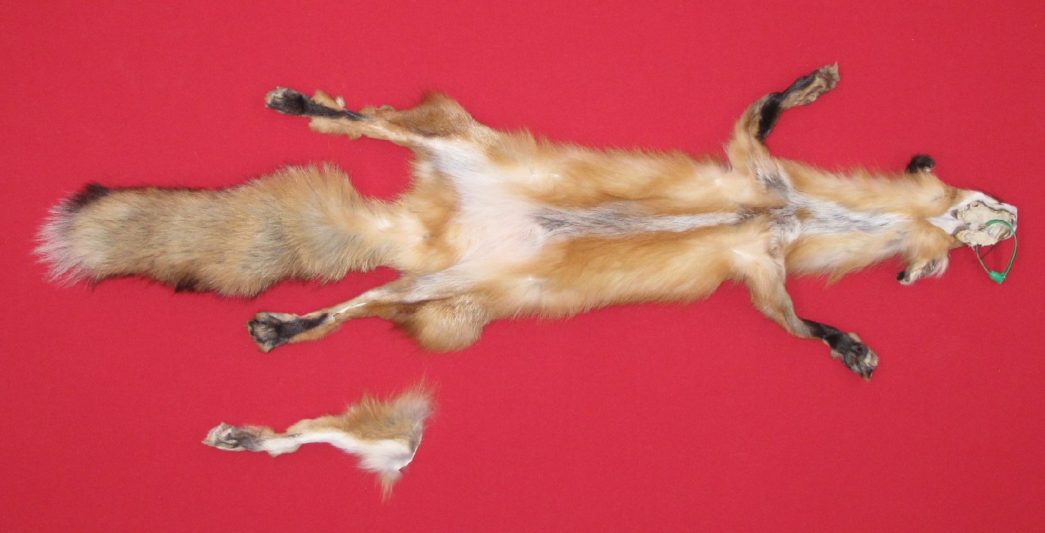 Lot # 6901-0446PennsylvaniaLM, 27-29" long plus tail medium red color extra super heavy eastern PA type fur cased HAS FEET & CLAWS, ears turned, lips split, etc. #1 except ~1.25" repairable cut in upper left legskin; ~1 x 1/2" area of fur missing from rear right legskin ~3.25" above right rear foot (repair material enclosed); ~2 x 1/4" longitudinal cut ,bare area on left rear legskin (repair material enclosed); quarter size blemish just behind left ear; otherwise leather very slightly damaged. Fur on neck very slightly weak. SUITABLE FOR RUG OR LIFE-SIZE. Good practice skin $137.50 /eaFR-112 |