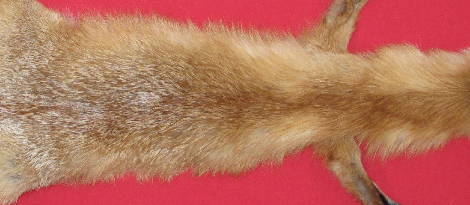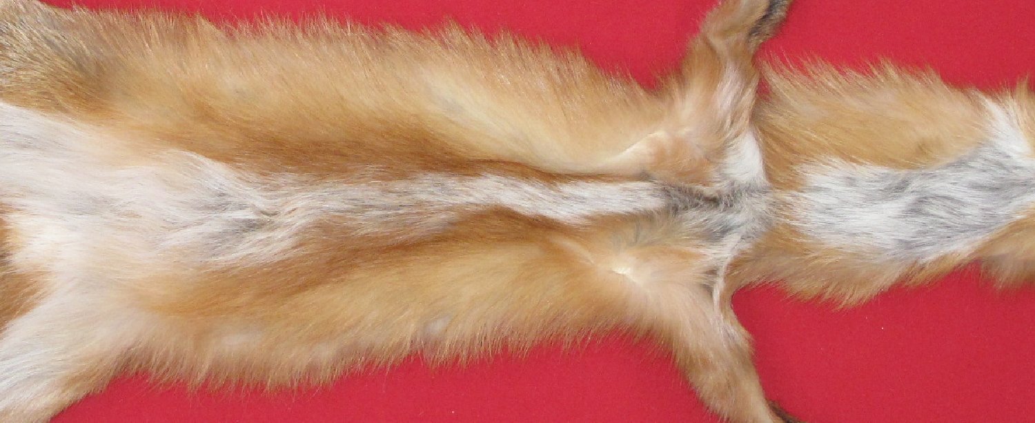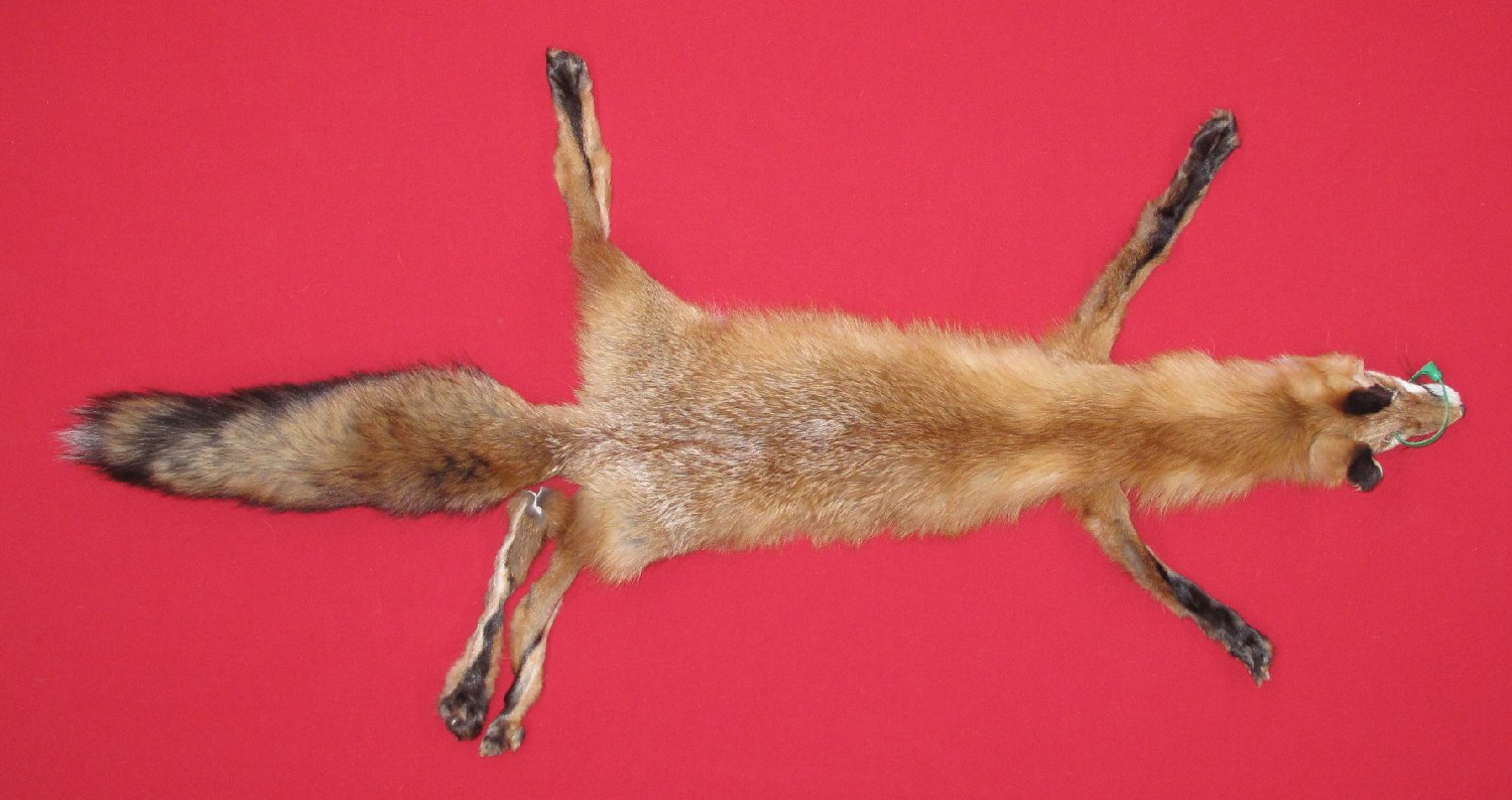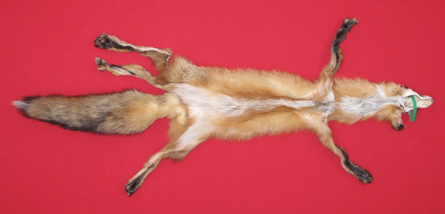 Lot # 6901-0447Pennsylvanialarge size, 29-31" long plus tail bright red color extra super heavy eastern PA type fur cased HAS FEET & CLAWS, ears turned, lips split, etc. #1 except small area missing from right rear skin just anterior of right rear foot (replacement material provided); otherwise leather very, very, very slightly damaged. SUITABLE FOR RUG OR LIFE-SIZE. $237.50 /eaFR-112 |