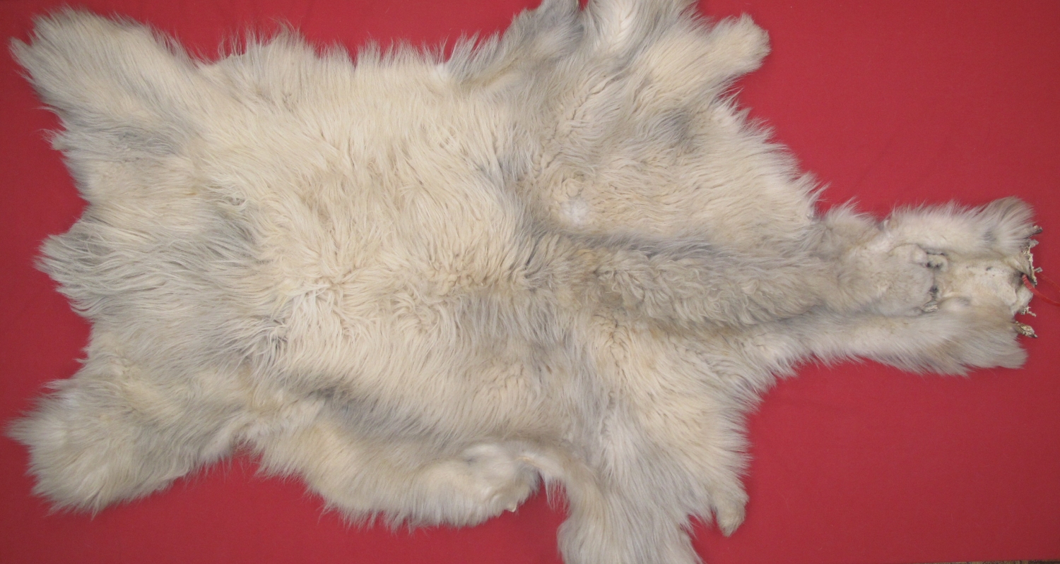 Lot # 7045-0010Idaho70" total length; NTB = 64 has head, tail super, super heavy winter fur abdominal cut Mature male goat. Ears turned, lips split (small areas of lips torn away). Probably tanned ~30+ years ago. #1 except leather very, very slightly damaged (some small cuts in head); has been soiled. Leather tears somewhat easily. Kept in cabin, probably has smoke stains on it. Fur has extra small rubs on shoulders. Good skin for cabins, display, etc. This skin is from a huge male goat $250.00 /eaArea 51 Quantity Available: