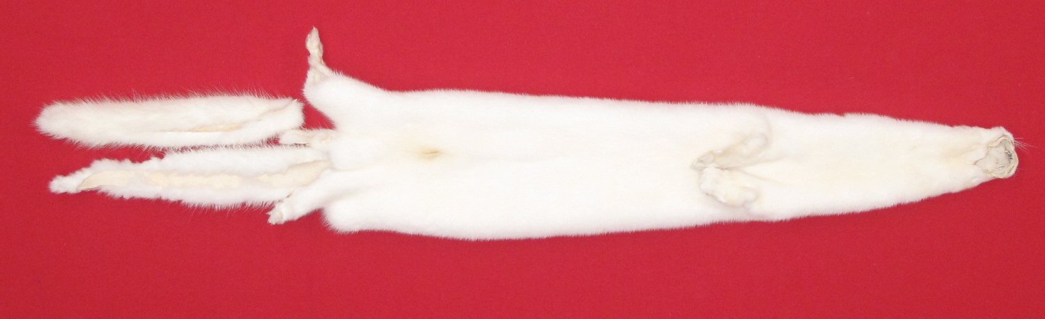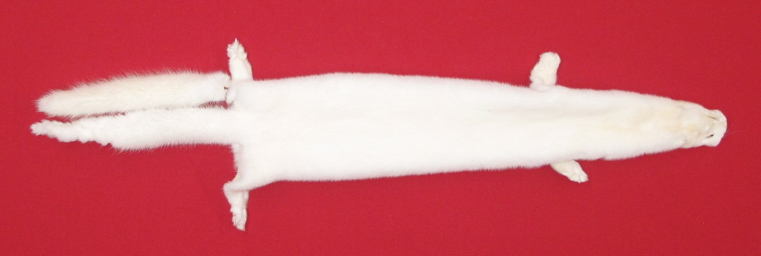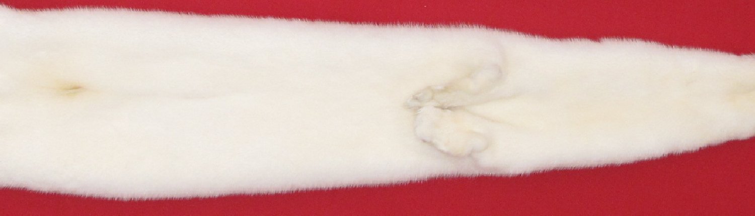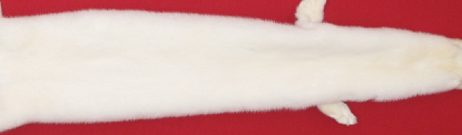 Lot # 7122-0028Ranched; WHITE, male29" long plus tail white color short nap type ranch fur cased HAS FEET & CLAWS, ears turned, lips split, etc. #1 except ~4" of posterior part of tail secondary quality (replacement provided); otherwise leather very, very, very slightly damaged. SUITABLE FOR LIFE-SIZE. Gorgeous select quality fur. Beautiful skin $399.95 /eaFR-511 |
