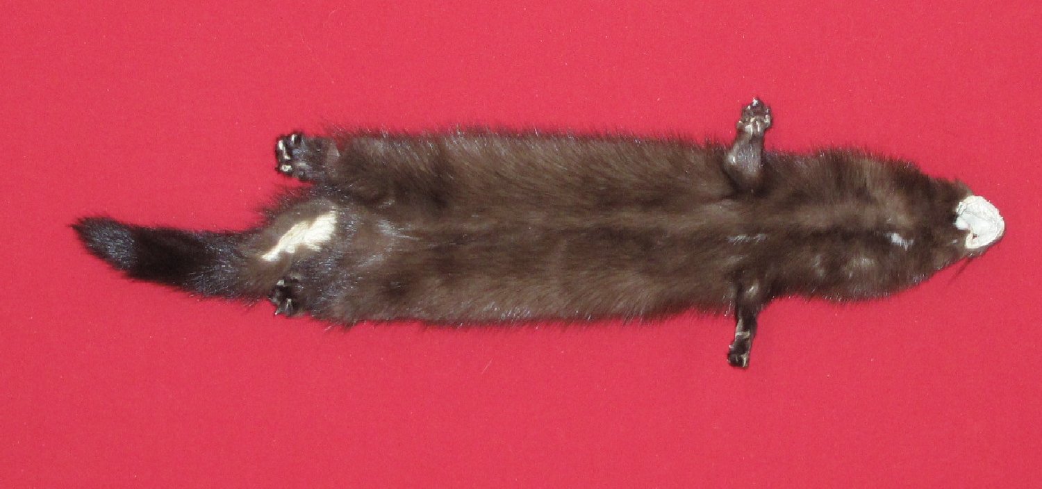 Lot # 7127-0151Wisconsin, male16" long plus tail extra dark color super heavy winter fur cased HAS FEET & CLAWS, ears turned, lips split, etc. #1 except leather very slightly damagd. SUITABLE FOR LIFE-SIZE. Nice skin $69.95 /eaFR-511 |