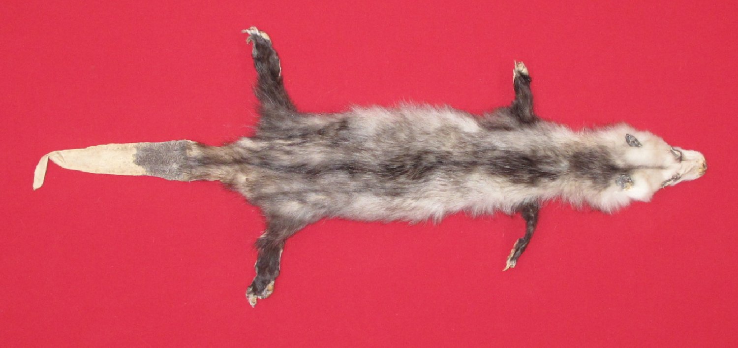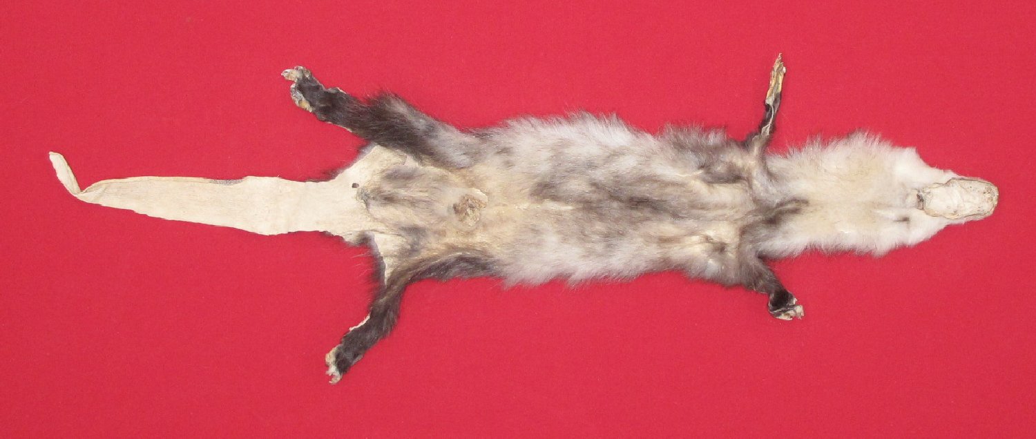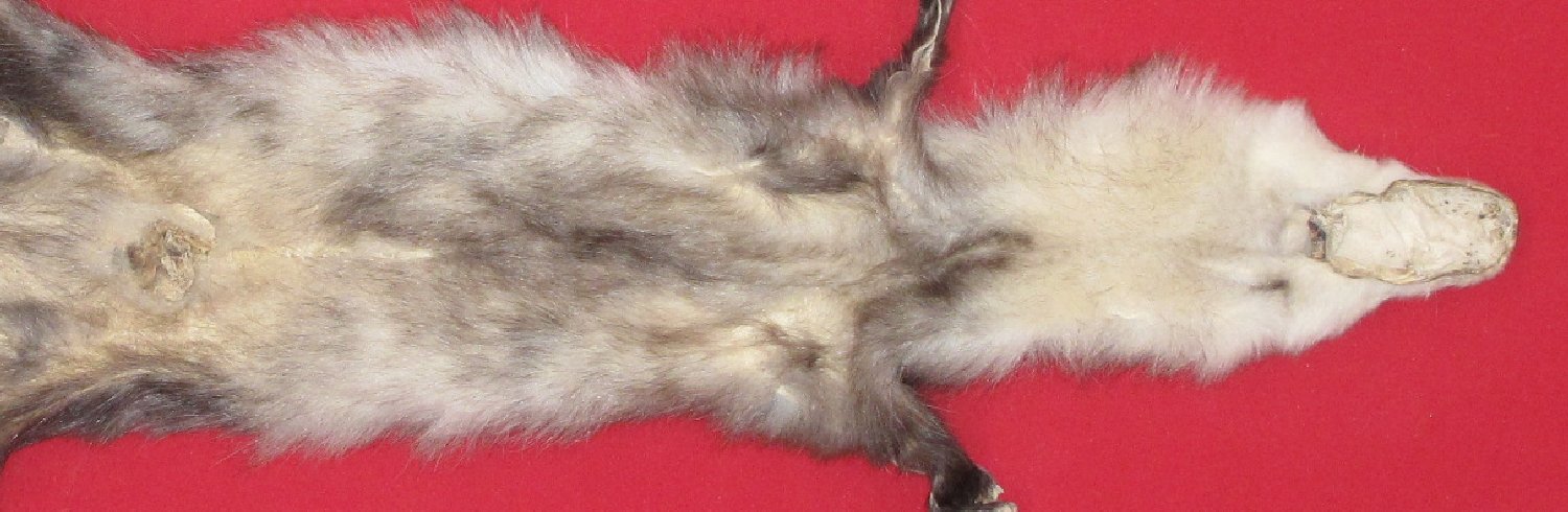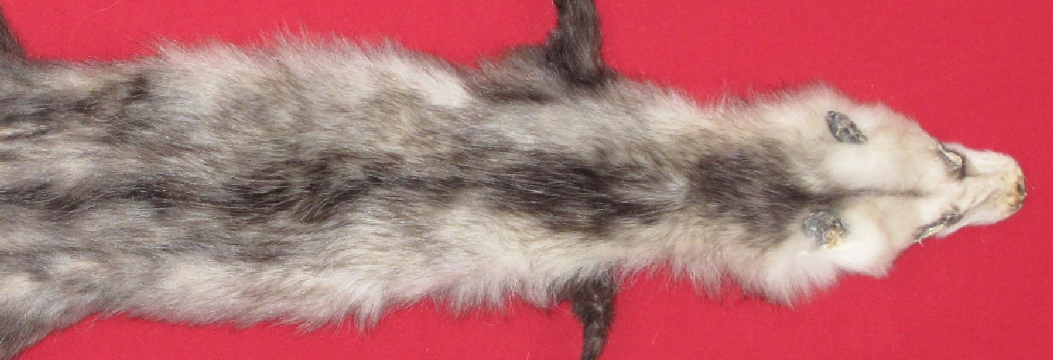 Lot # 7220-0886SW Idaho Snake River Country; male24" long plus tail black hairs with silver tips, white underfur heavy early fall fur cased HAS FEET & CLAWS, ears turned, lips split, etc. lips split, etc. #1 except ~2.25" hunter sewn tear starting at anterior edge of pouch and running in an anterior direction; ~4.25" hunter sewn tear in anterior right hip area; ~2.25" tear in anterior edge of pouch. One claw missing from each rear foot; one claw missing from right front foot. Good specimen skin for schools, etc $59.95 /eaFR-422 |