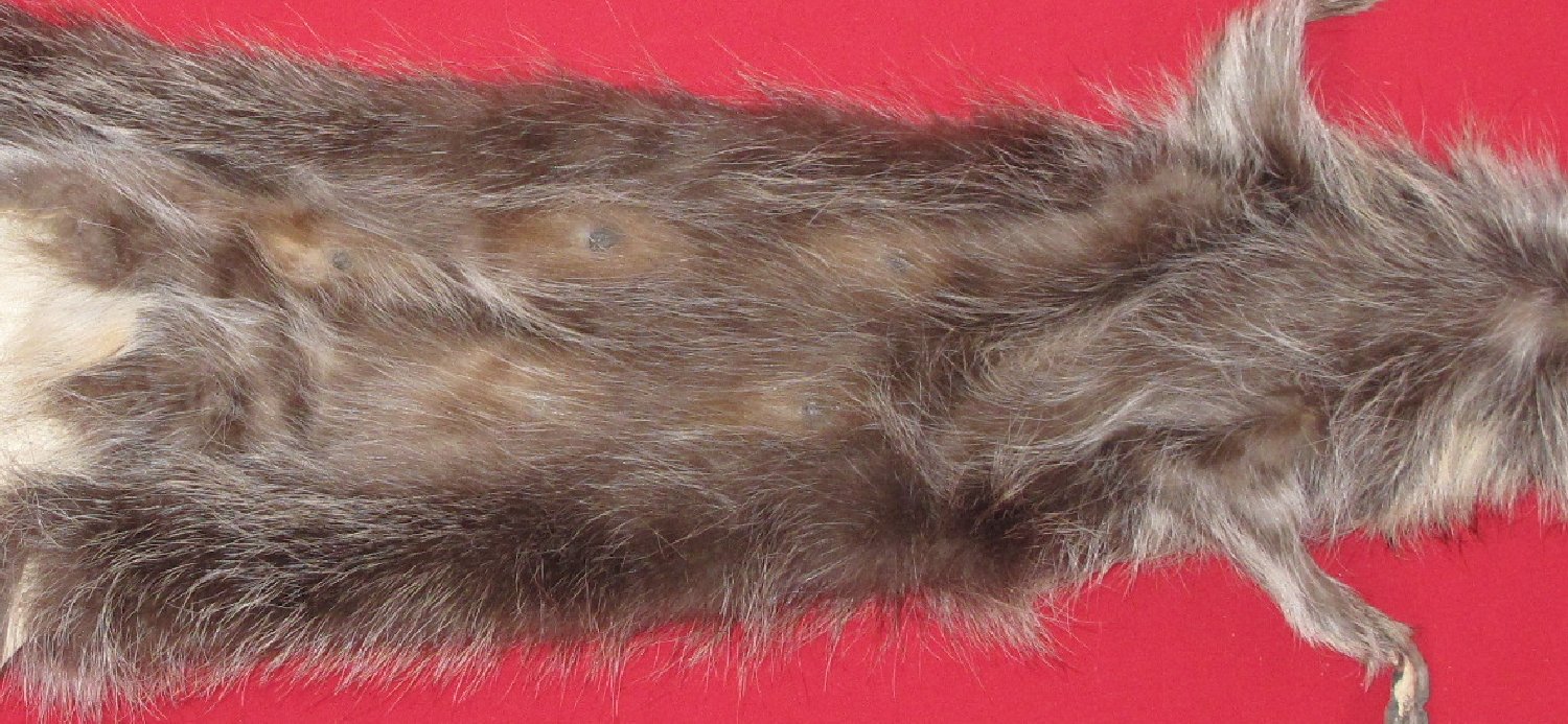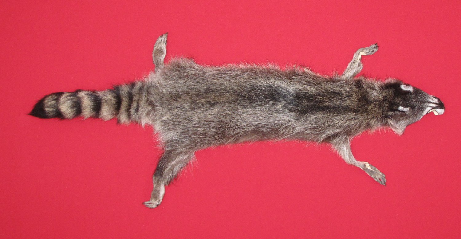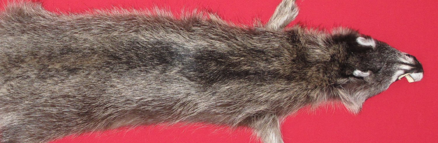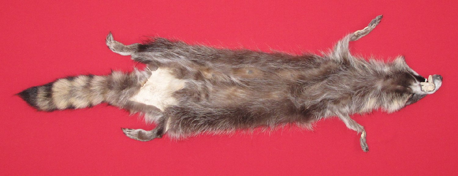 Lot # 7270-2366Idaho. Pacific Northwest raccoon. Procyon lotor pacificusXL, 30-32" long plus tail medium dark color super heavy late fall fur cased mature female, has had young in prior year. HAS FEET & CLAWS, ears turned, lips split, etc. #1 except ~3/4" and 1/4" cuts in abdomen. ~1.25 x up to 1/2" bare area on each front legskins just posterior of foot. Big coon for this section of US. Good specimen skin $125.00 /eaFR-541 |