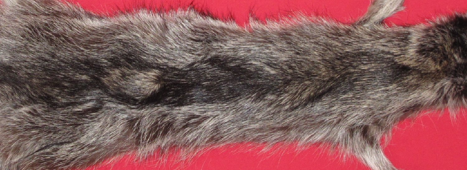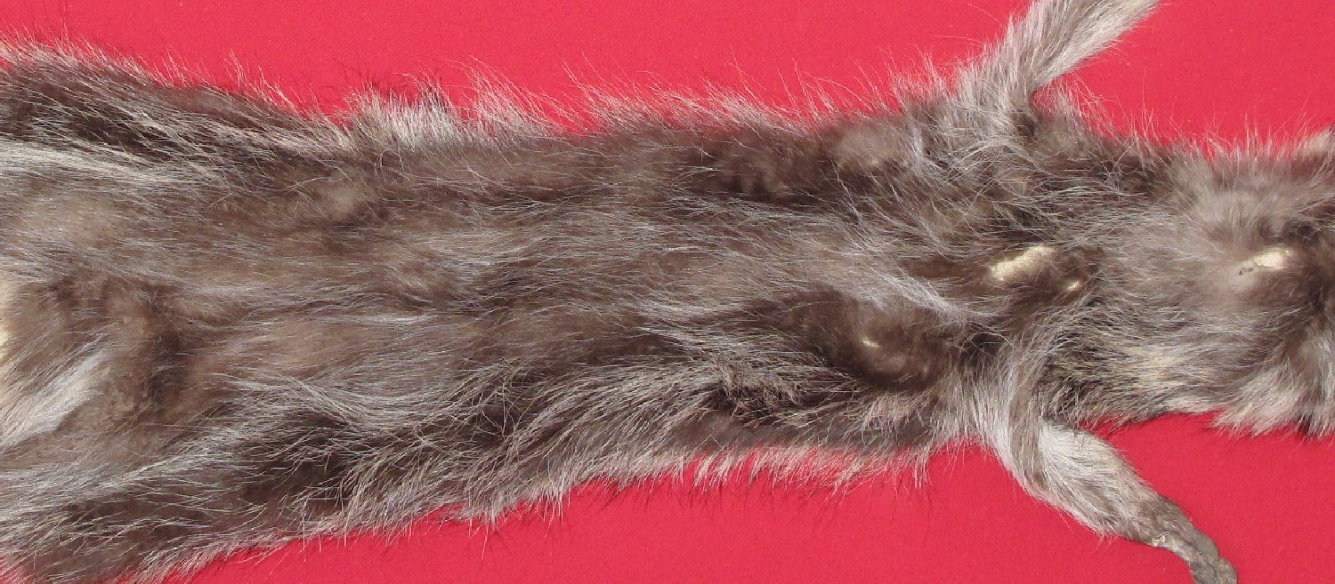 Lot # 7270-2367Idaho. Snake River Valley subspecies. Procyon lotor excelsusXL, 28-30" long plus tail extra dark color extra siuper heavy winter fur cased HAS FEET & CLAWS, ears turned, lips split, etc. #1 except 3/4" cut in underside of neck; ~1.25" cut between front legs. ~1/4" cut in left flank. Six front claws broken, worn badly. Secondary quality tail (replacement provided). Some hairs missing just posterior of front feet. $69.95 /eaFR-541 |