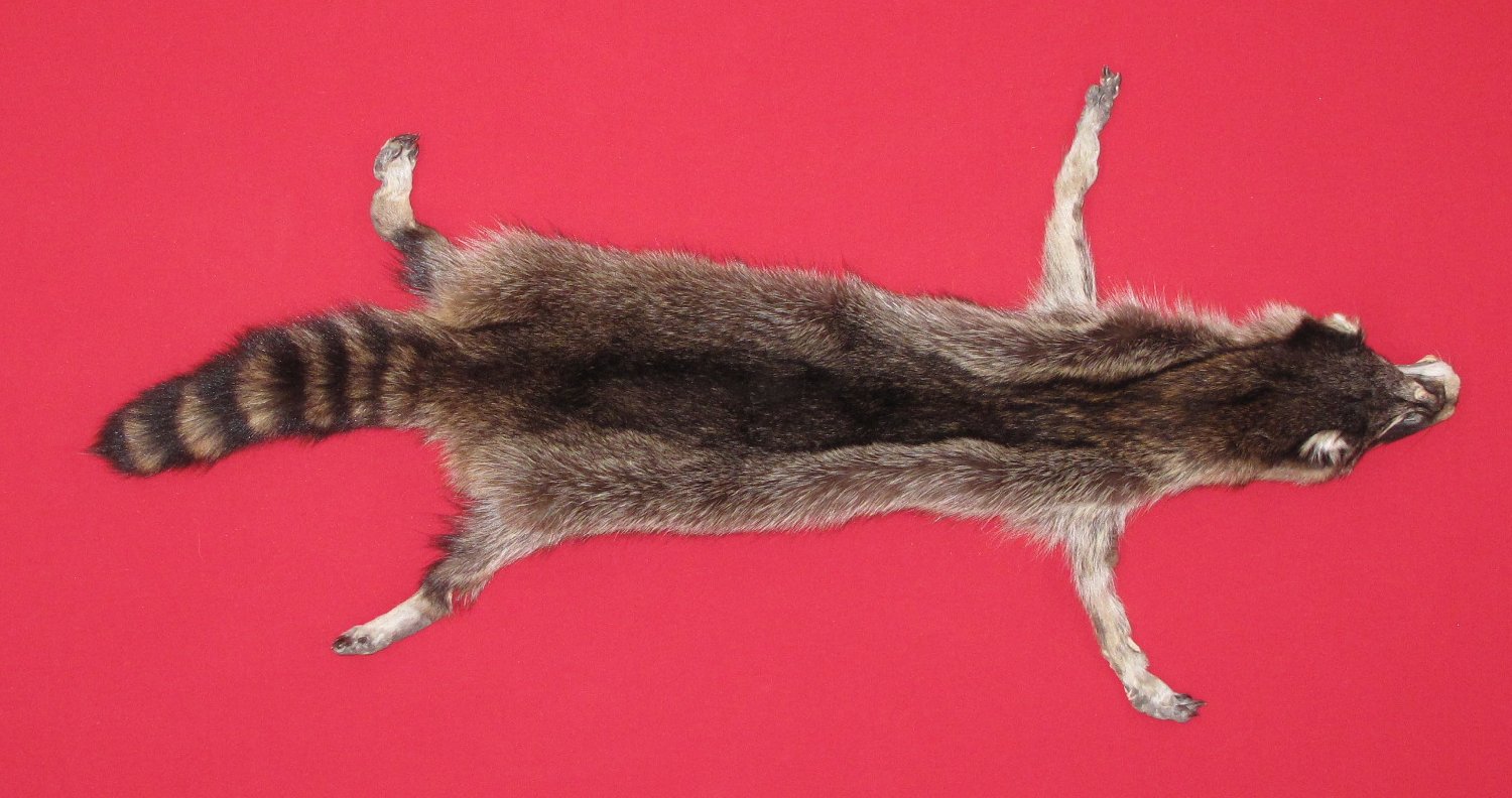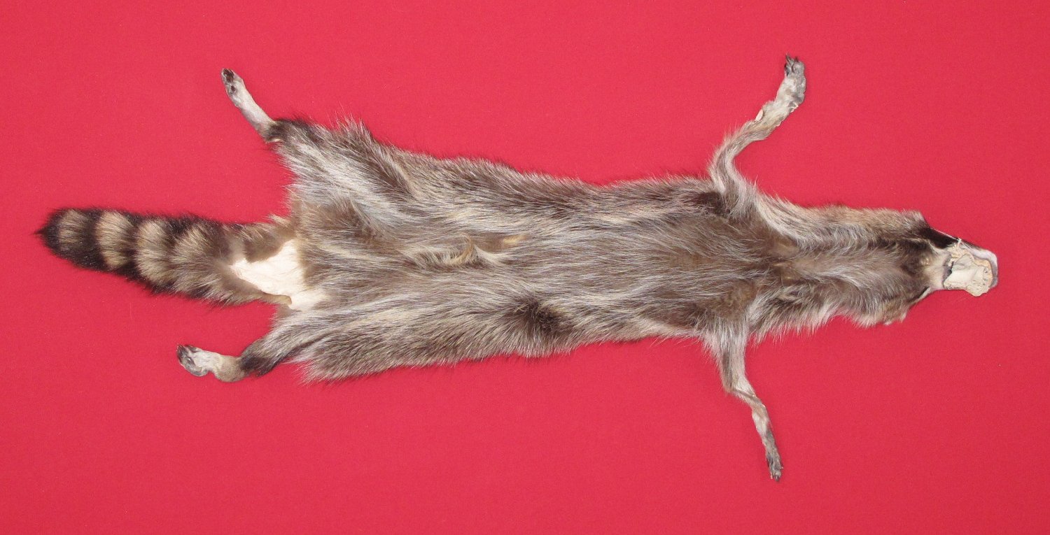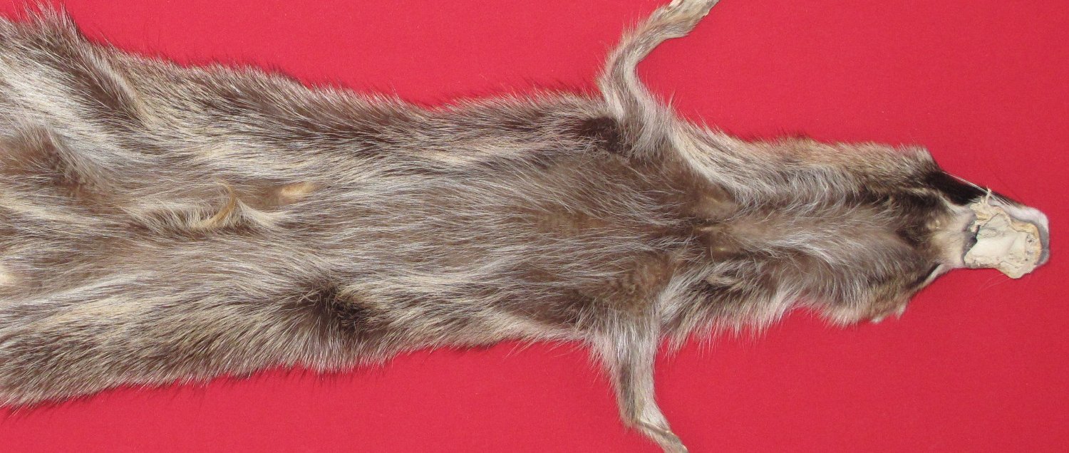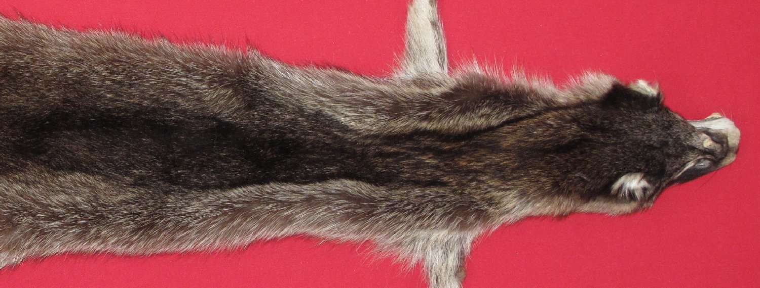 Lot # 7271-0776Wisconsin. Upper Mississippi Valley subspecies. Procyon lotor hirtusXL, 28-30" long plus tail extra dark color extra super heavy winter fur; extra soft cased HAS FEET & CLAWS , ears turned, lips split, etc. #1 except BB size hole in snout with half making it a m BB size repairable blemish. SUITABLE for RUG OR LIFE-SIZE. Exceptionally nice fur. Beautiful fur. Nice extra silvery belly $135.00 /eaFR-531 |