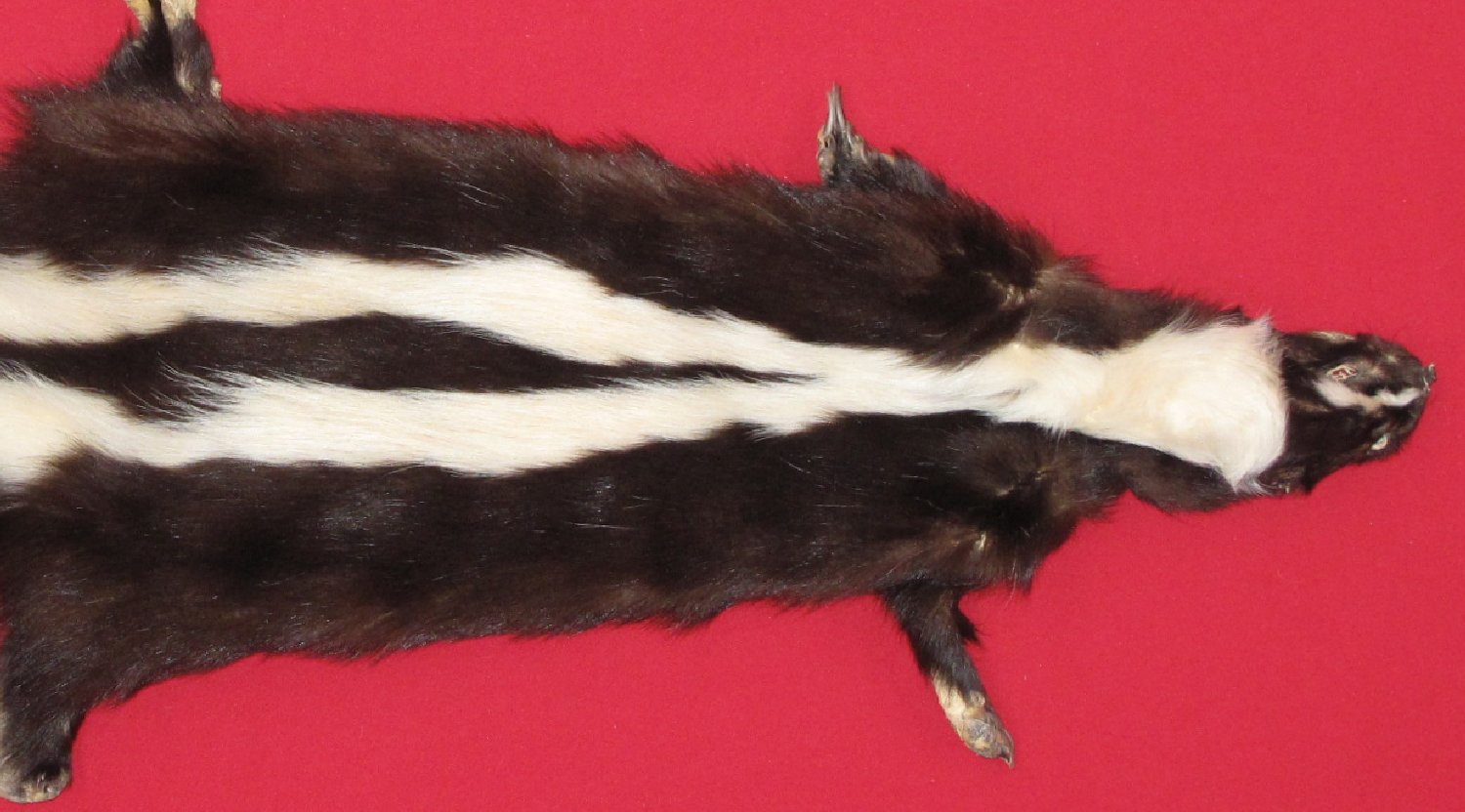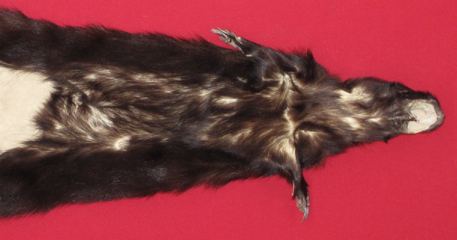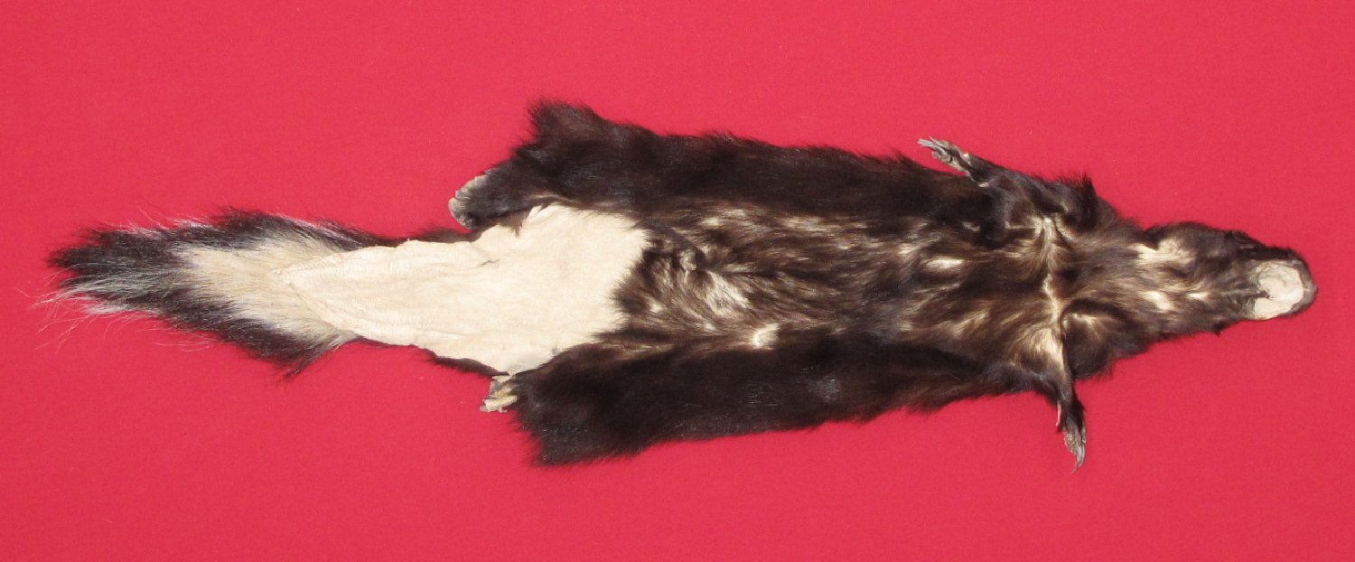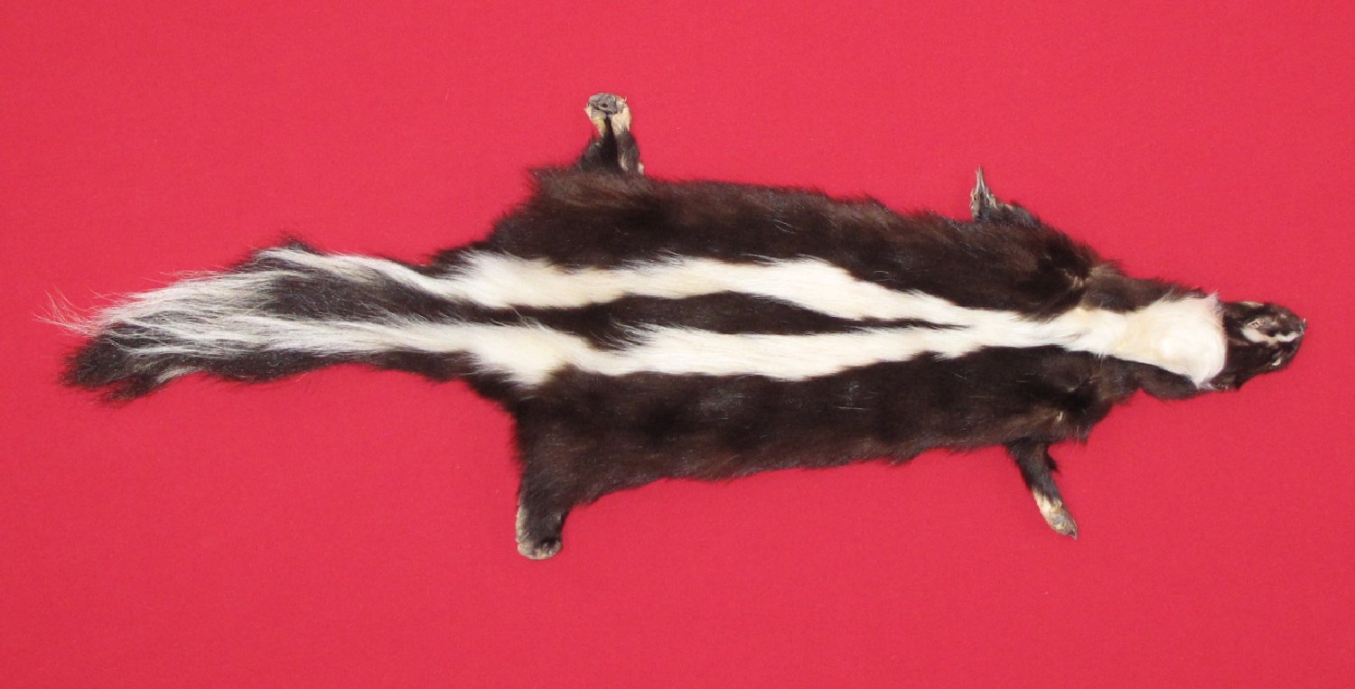 Lot # 7370-1694WesternXXXL, 24-26" long plus tail bright white wide stripes extra super heavy winter fur cased HAS FEET & CLAWS. #1 except scattered bare spots on underside of neck; leather very slightly damaged. Nice tail. Good big specimen skin $149.95 /eaFR-535 |