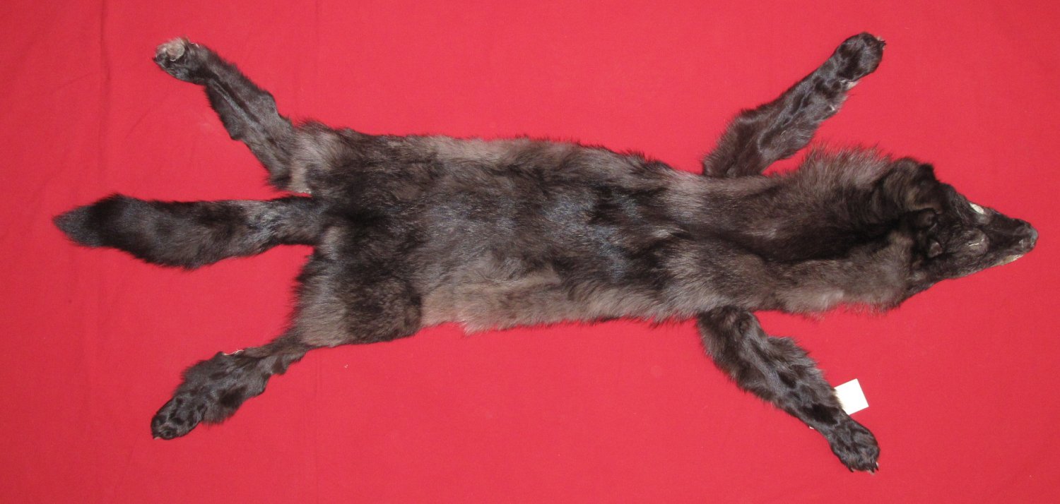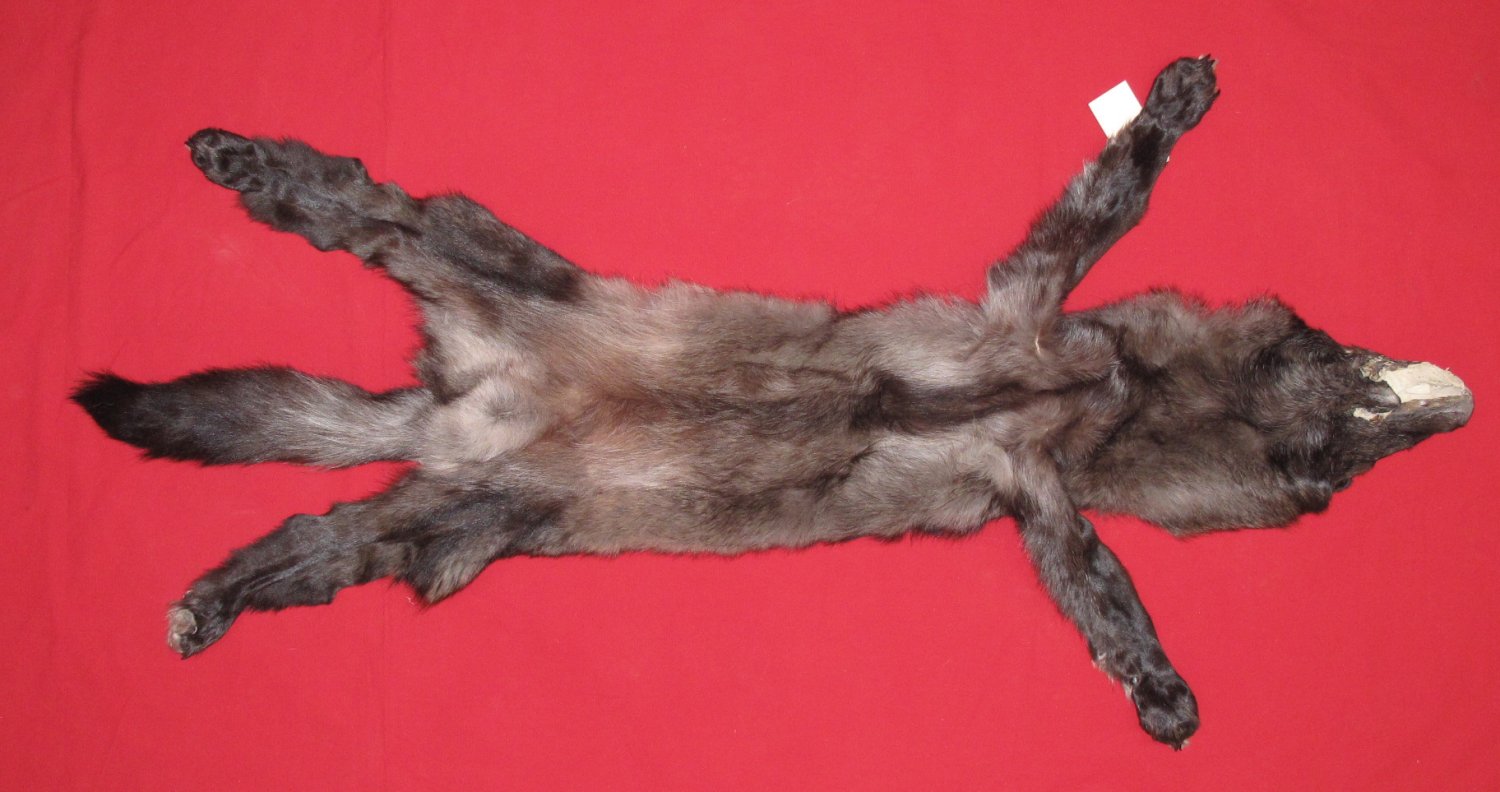 Lot # 7480-2328Eastern Canada76" total length; NTB = 54 black with silver guard hairs super heavy winter fur cased HAS FEET & CLAWS, ears mostly turned, lips split, etc. #1 except small beetle larvae chewn holes in ~8x9" area of posterior abdomen (beetle larvae chew only on leather, not on fur); otherwise leather very, very, very slightly damaged. Guard hairs missing from ~6 x 1 to 1.5" area on posterior right flank (probably not noticeable to untrained eye). Nice skin $599.95 /eaBkskn Roo Quantity Available: