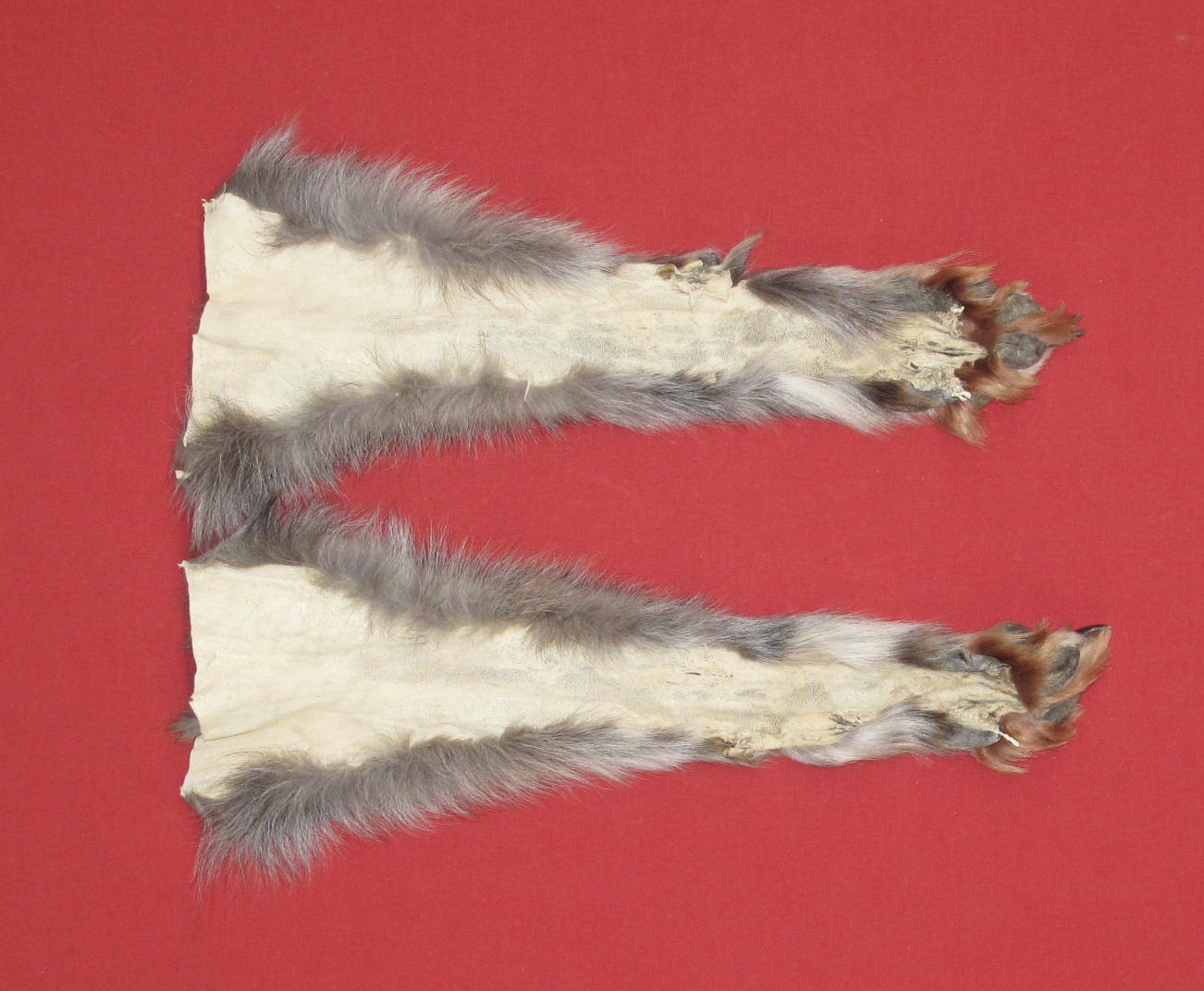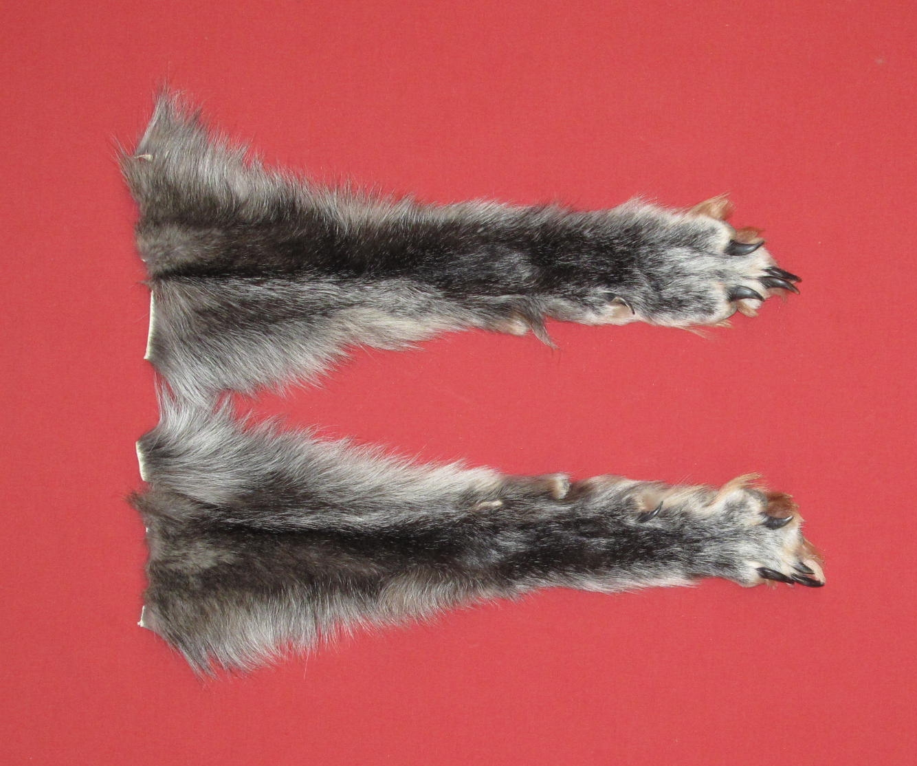 Lot # 7485-0719Canada; FRONT LEGSKINS, with claws16-17" long black with silver hairs extra super heavy winter fur abdominal cut #1 except 1" x 1/4" bare spot on right legskin (not readily noticeable due to color of legskins). Nice legskins/feet. HUGE CLAWS! $139.95 /prFR-422 Quantity Available: